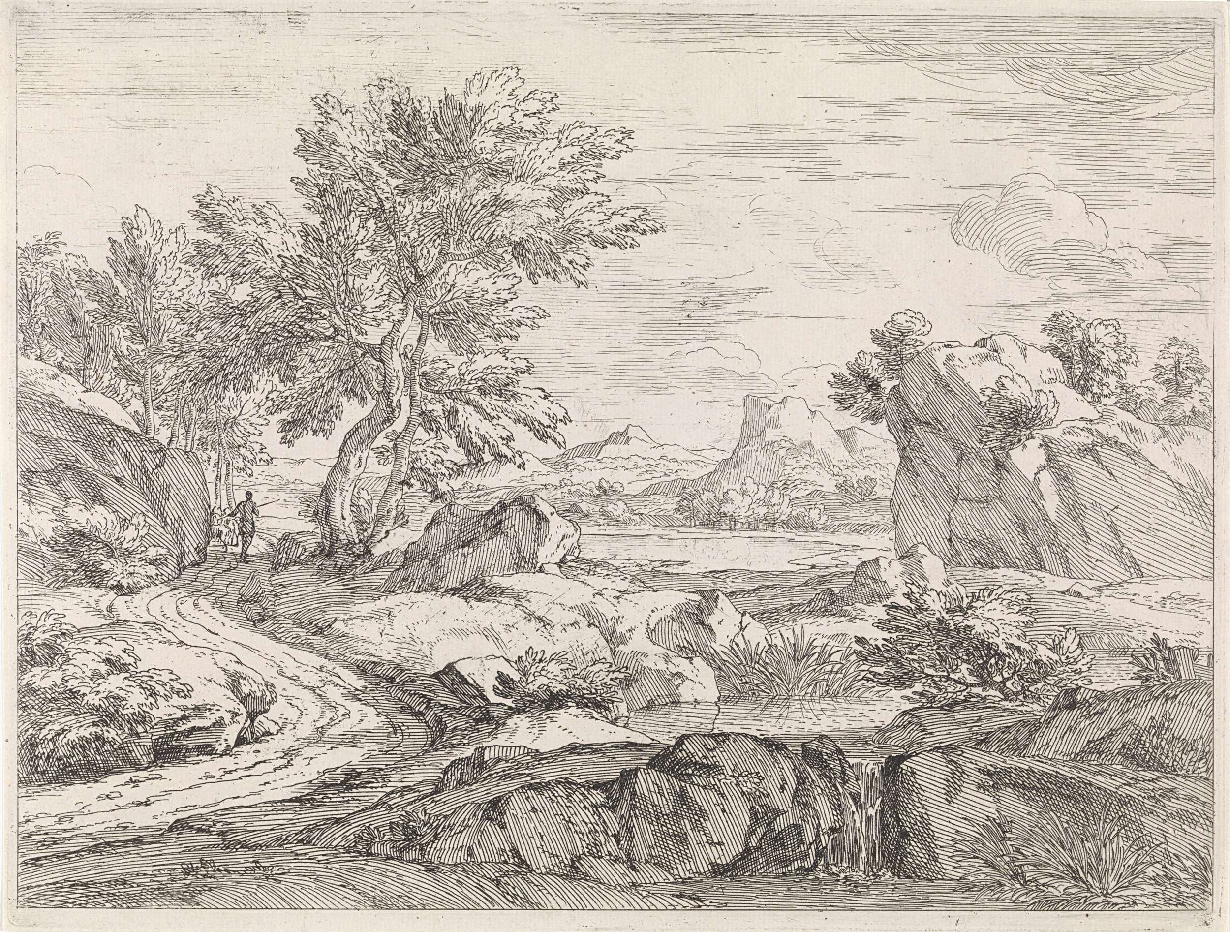 Een landschap met rotsen en een weg. Naast de weg een kleine beek en een waterval. De prent maakt deel uit van een serie van rivierlandschappen.