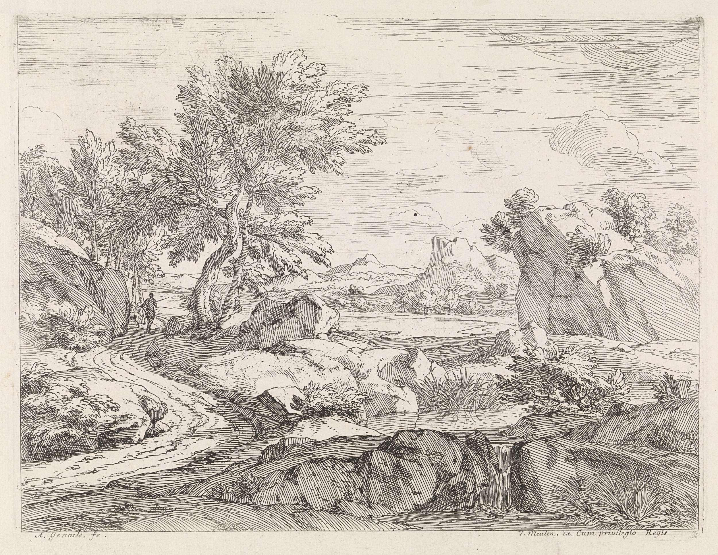 Een landschap met rotsen en een weg. Naast de weg een kleine beek en een waterval. De prent maakt deel uit van een serie van rivierlandschappen.