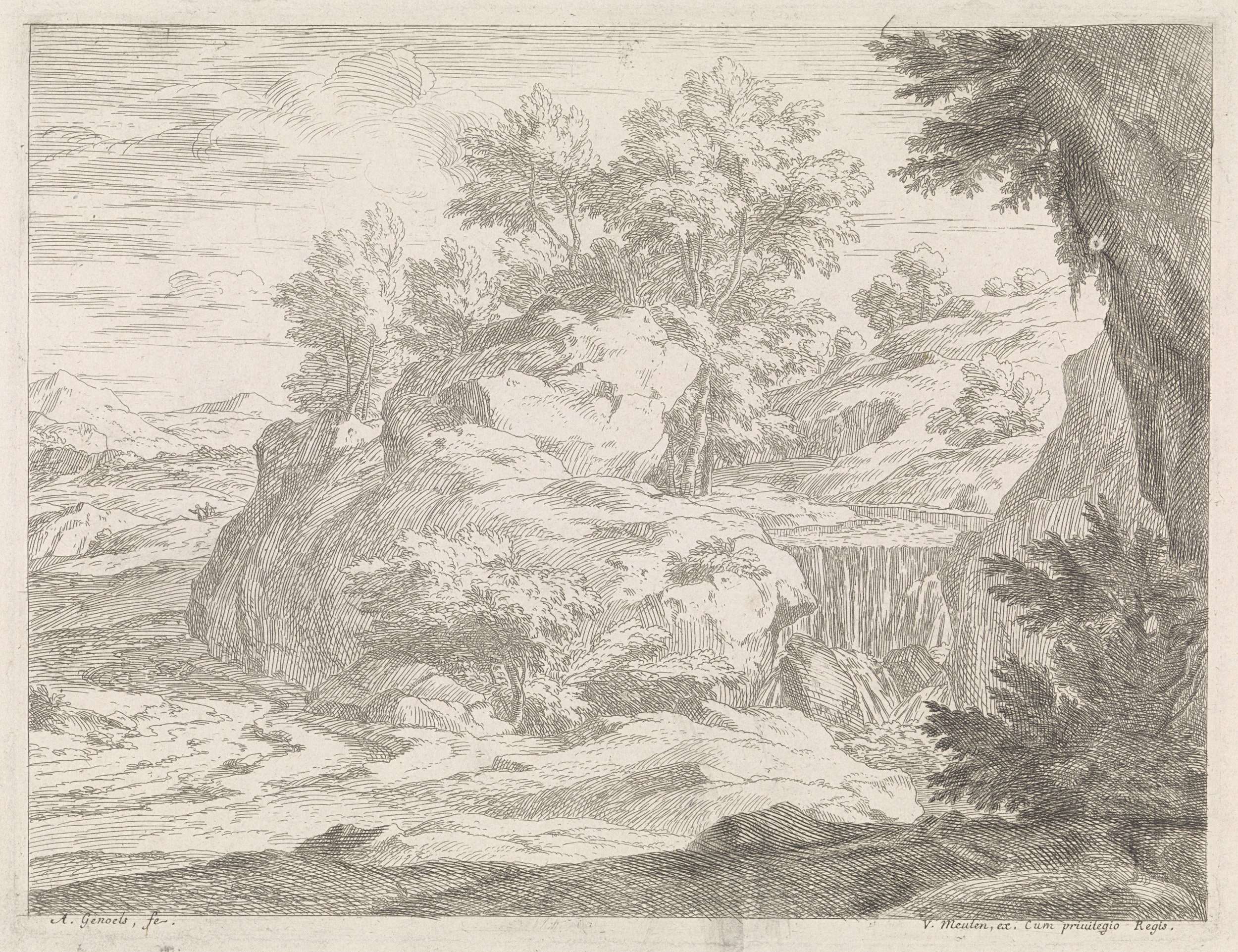 Een heuvelachtig landschap met een waterval tussen rotsen. De prent maakt deel uit van een serie van rivierlandschappen.