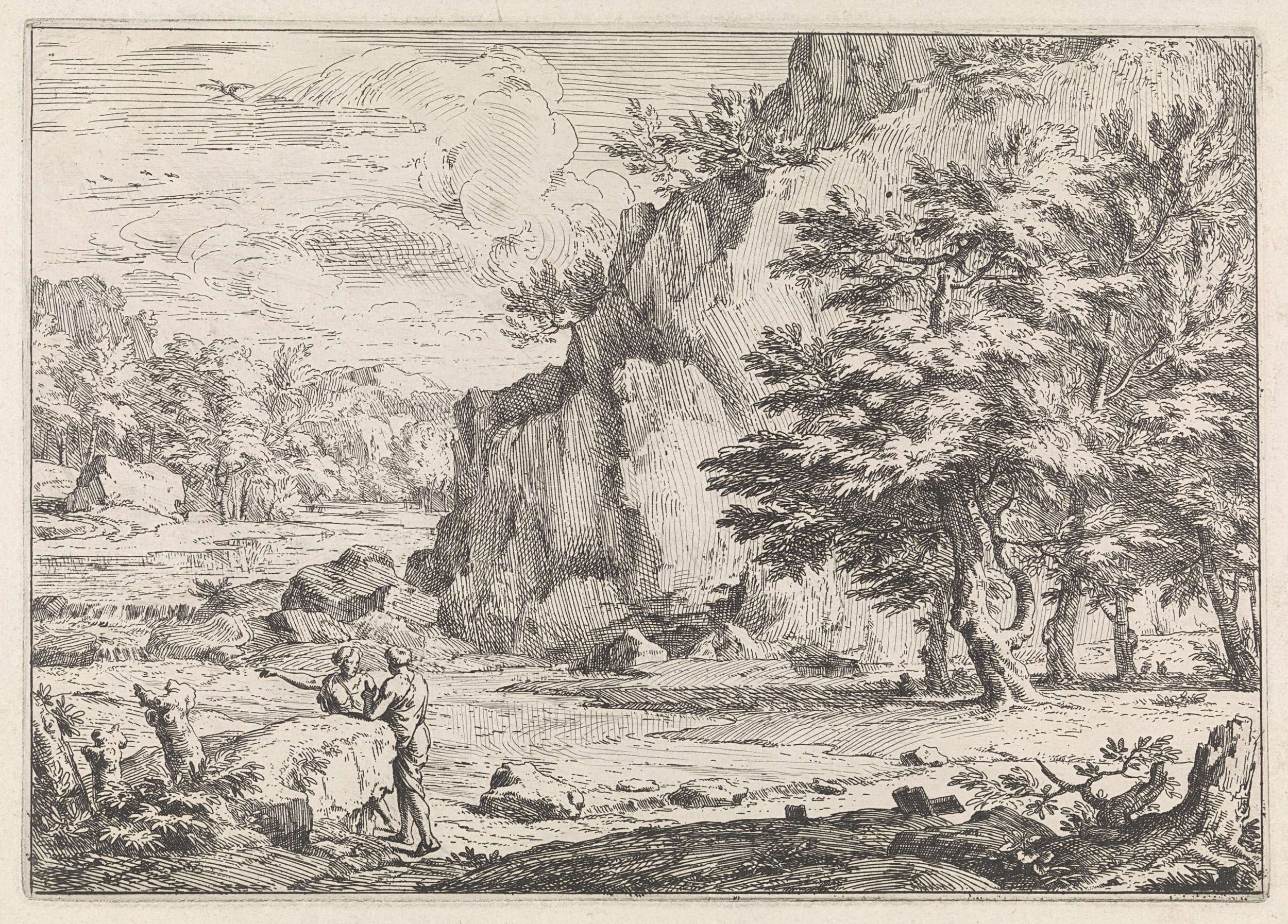 Een heuvelachtig landschap met centraal een grote rotswand. Linksvoor twee figuren.