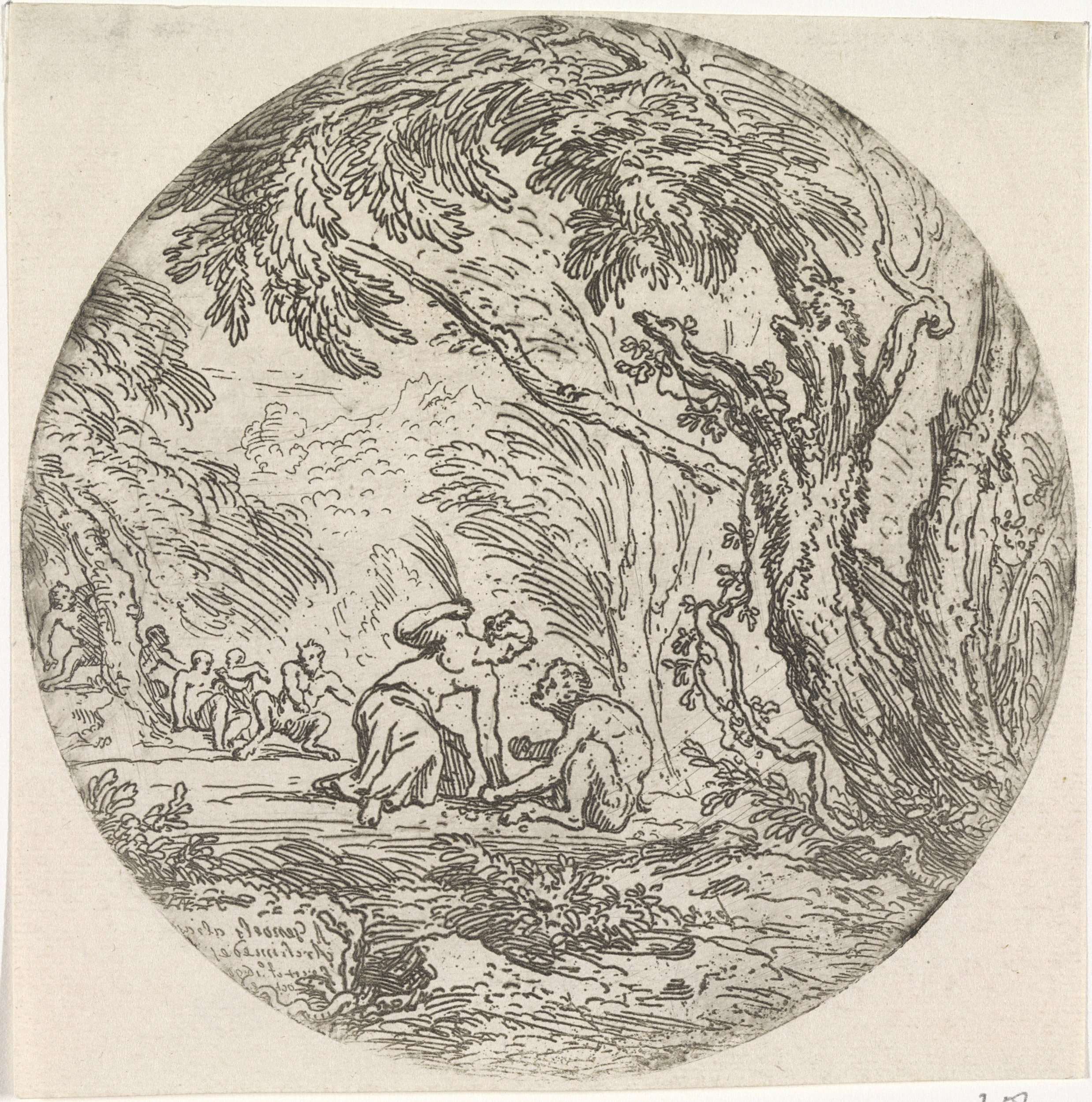 Arcadisch landschap met bomen. Op de voorgrond straft een nimf een sater met een roede.
