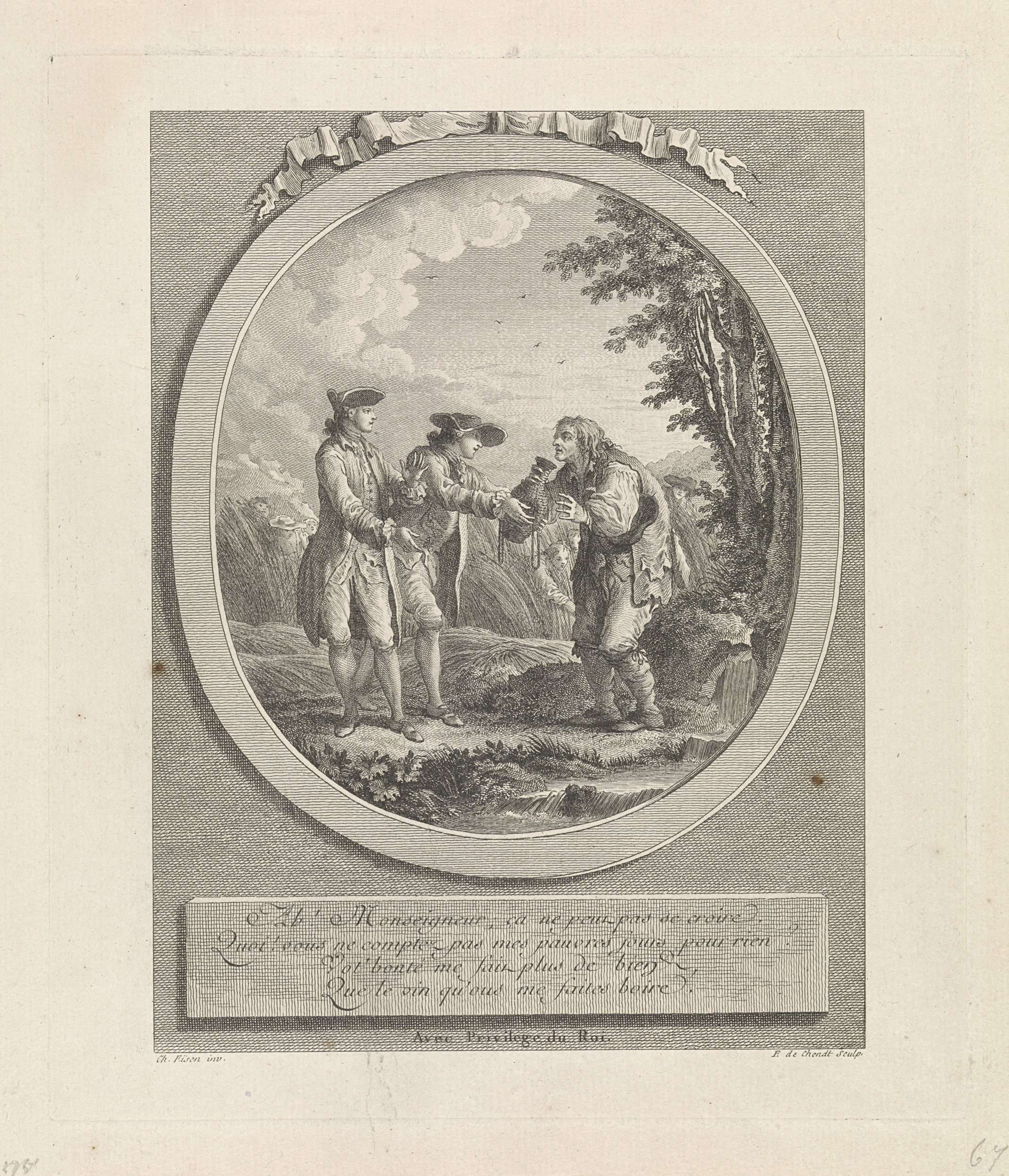 Twee jonge mannen bieden een arme boer te drinken aan. Op de achtergrond wordt door de andere boeren geoogst. De prent heeft een Frans onderschrift en is deel van een serie prenten met als onderwerp het toneelstuk "Les Moissonneurs" van Charles Simon Favart (1763).