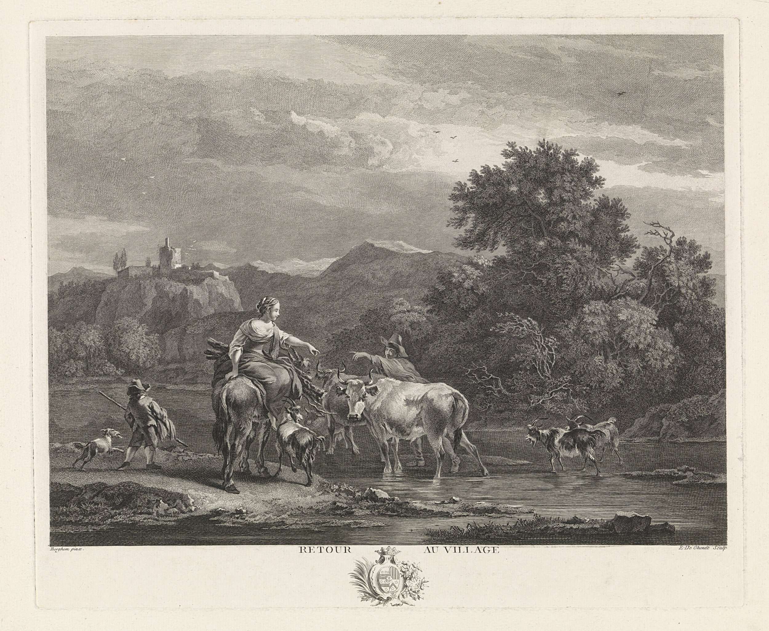Een herder, een herderin en hun zoontje met twee koeien, een ezel, drie geiten en een hond. Ze steken een rivier over. De herderin zit op de ezel. Op de achtergrond de ruïne van een burcht. Naar een schilderij van Nicolaes Berchem.