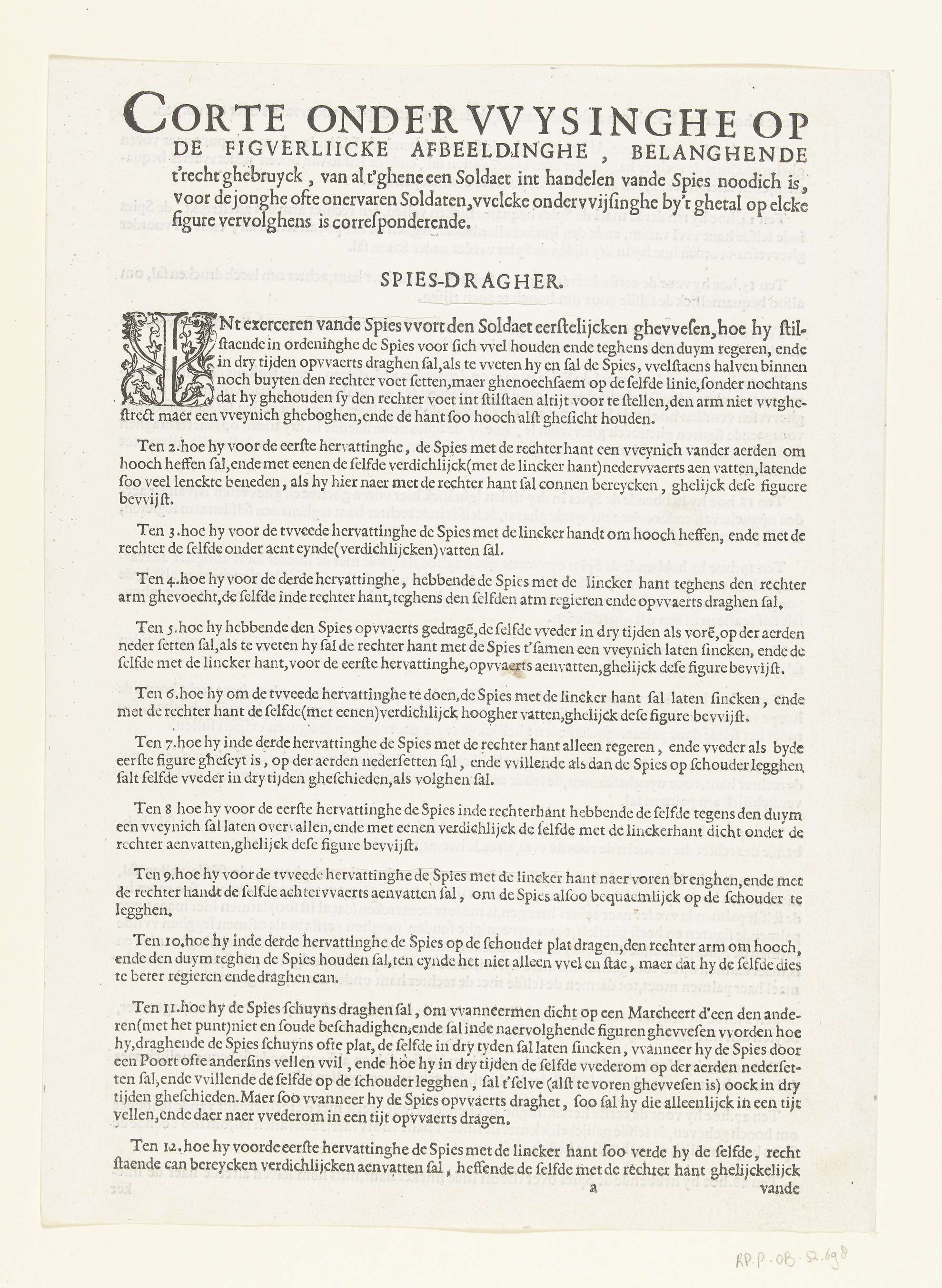 Eerste blad (bedrukt aan beide zijden) van een driebladige tekst over het gebruik van de spies (lans). Bevat aanwijzingen 1 t/m 28. Deze tekst vormt de inleiding tot een genummerde prentreeks van een soldaat die een spies hanteert; het geheel is onderdeel van de Wapenhandelinghe, die ook teksten en genummerde prentreeksen bevat die het hanteren ...