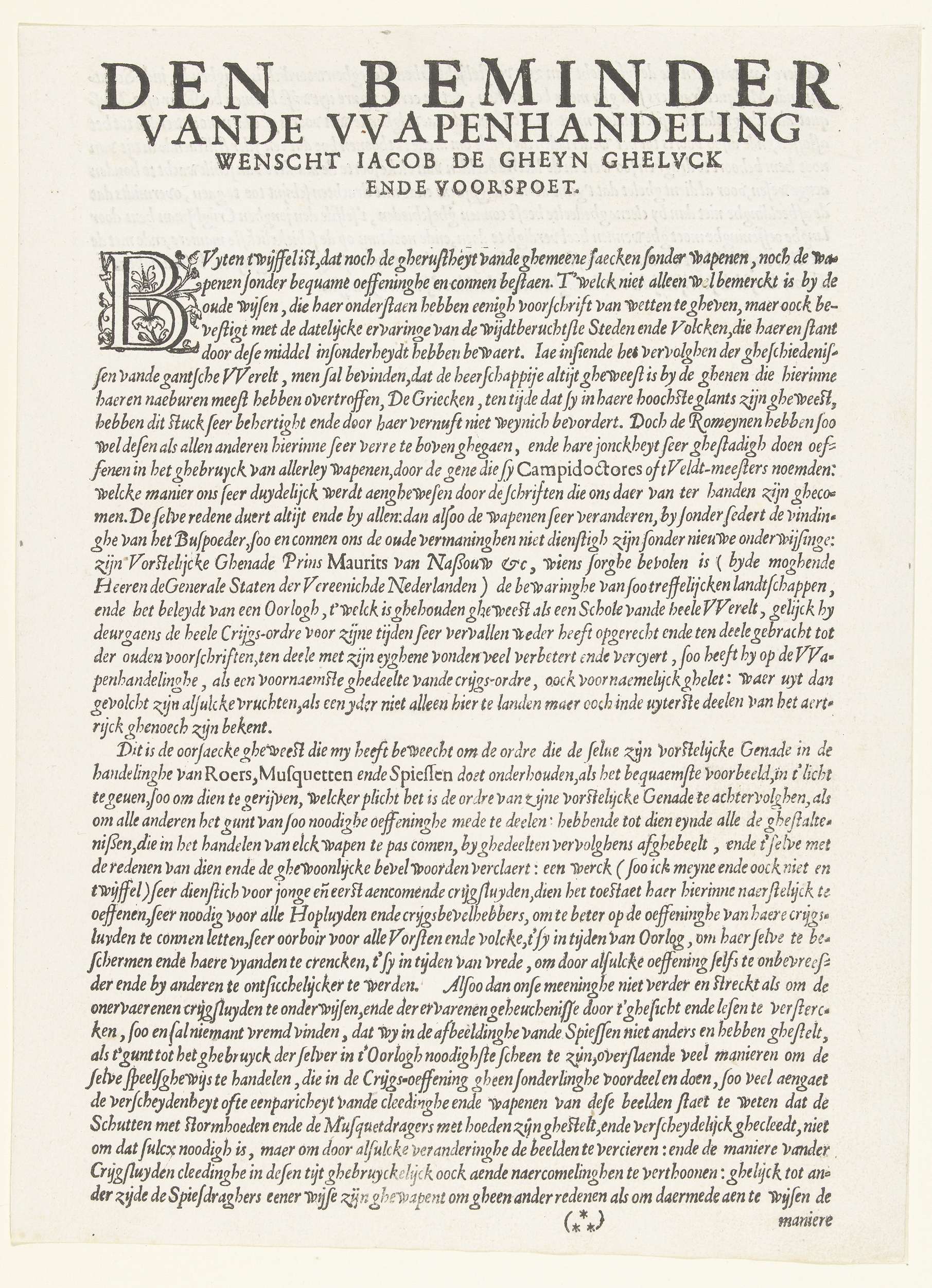 Tekst waarin Jacob de Gheyn uitlegt hoe hij ertoe gekomen is de Wapenhandelinghe te vervaardigen, hoe hij dit werk heeft opgezet en hoe het gebruikt kan worden. Tekstblad, bedrukt aan beide zijden. Deze tekst is de overkoepelende inleiding voor een geheel van drie inleidende teksten en genummerde prentreeksen die het hanteren van het roer, het ...