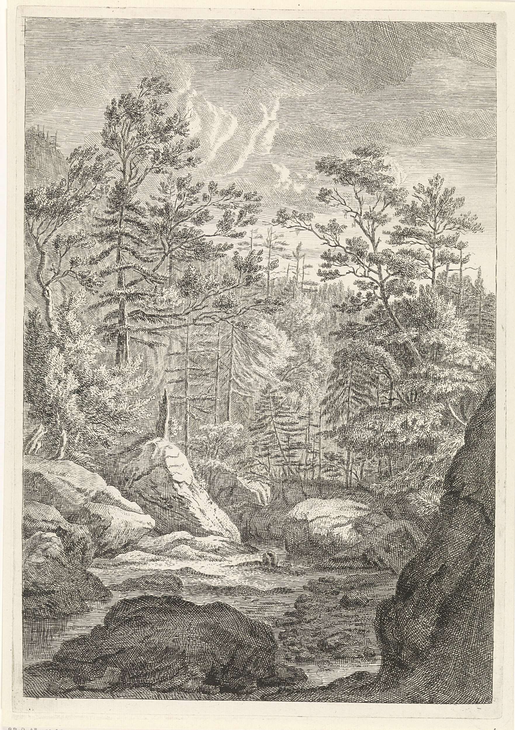Landschap met een ravijn, een beekje en enkele bomen. De prent maakt deel uit van een serie met berglandschappen in het Chartreuzer-gebergte.