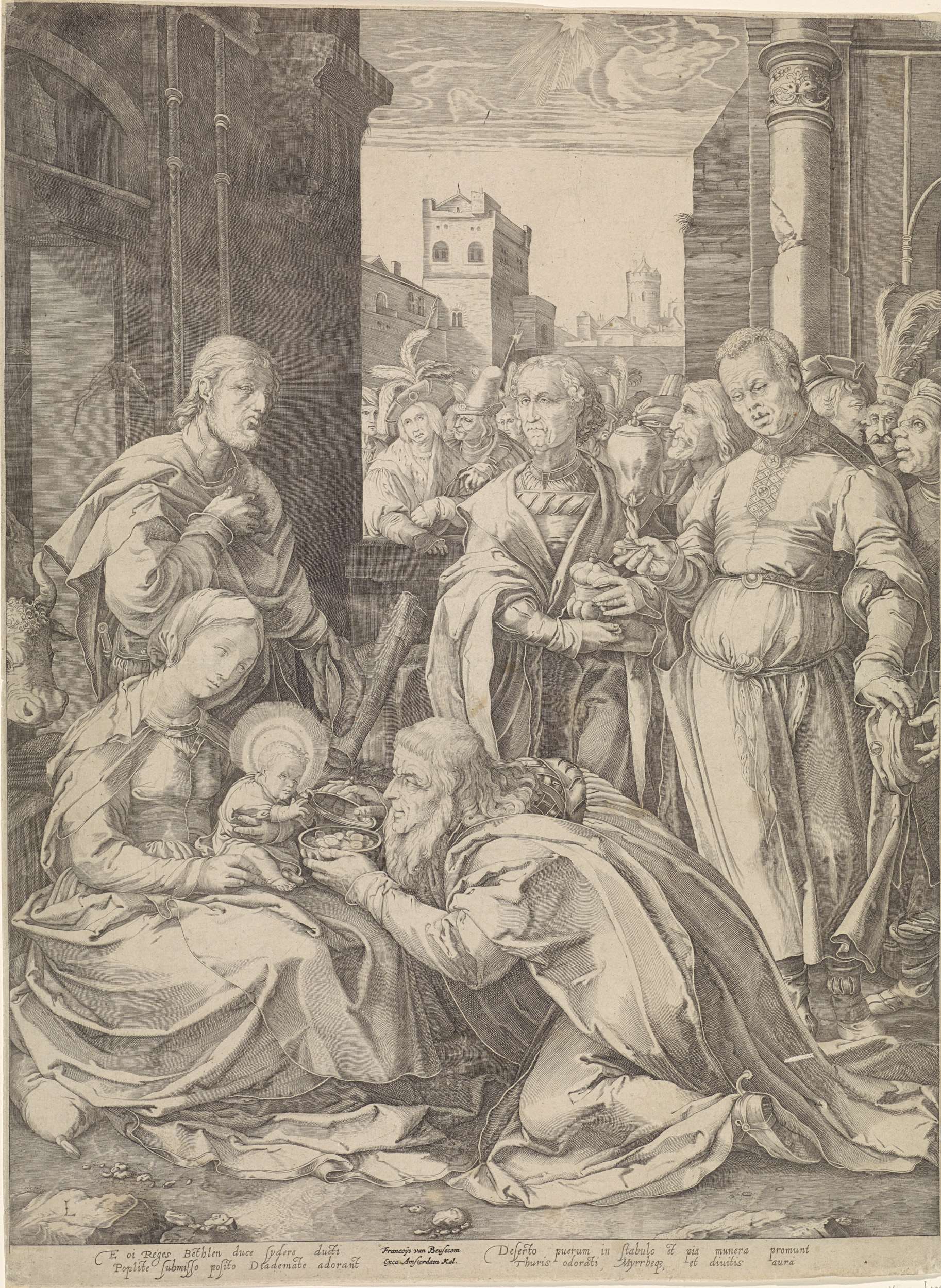 Maria en Jozef tonen, gezeten bij een ruïne, hun pasgeboren kind aan de drie koningen of wijzen uit het Oosten en hun gevolg. Onder de voorstelling vier Latijnse versregels. Het voorbeeld voor deze prent is onderdeel van een serie van zes prenten met scènes uit het vroege leven van Maria. Die worden de 'Meesterstukken' genoemd, ...