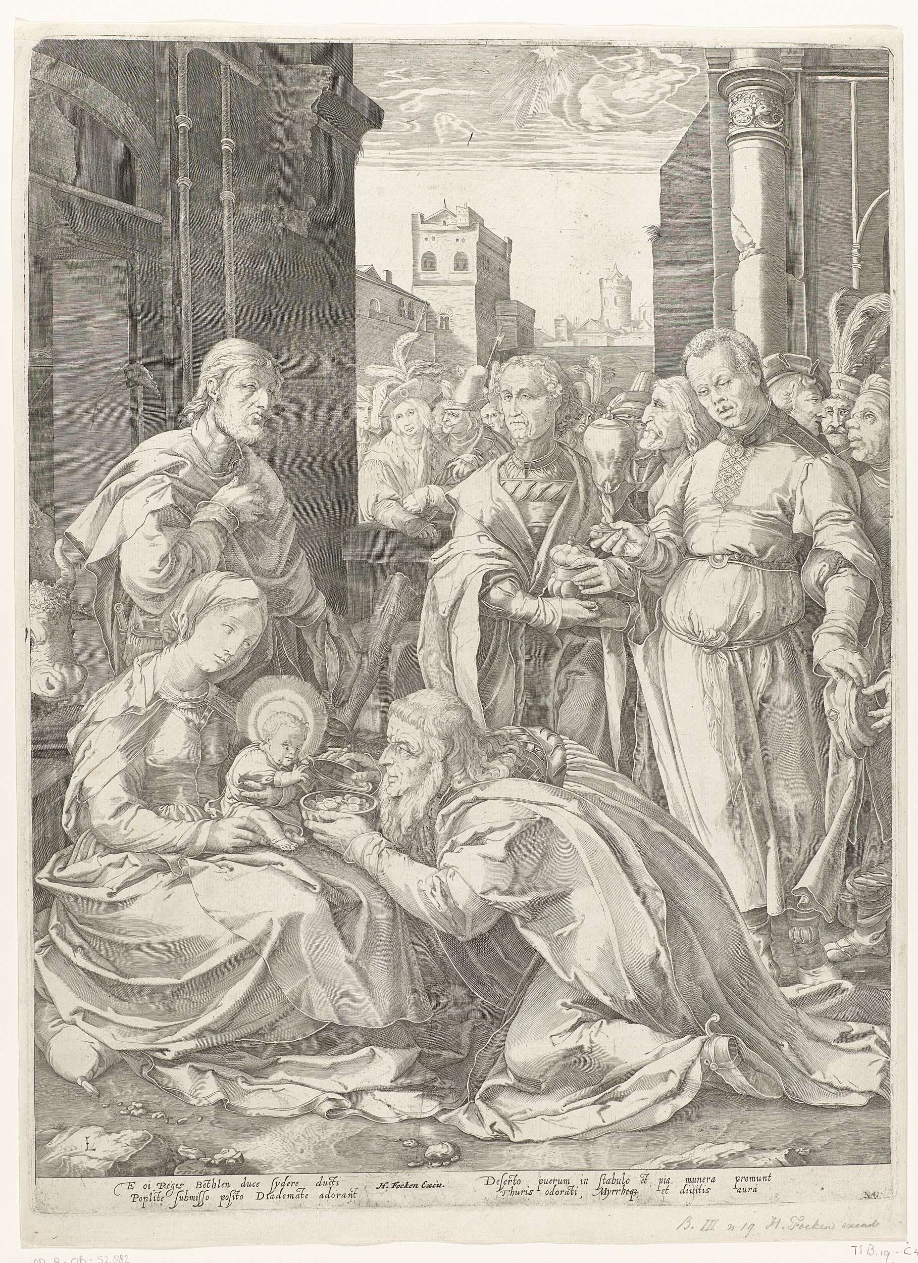 Maria en Jozef tonen, gezeten bij een ruïne, hun pasgeboren kind aan de drie koningen of wijzen uit het Oosten en hun gevolg. Onder de voorstelling vier Latijnse versregels. Het voorbeeld voor deze prent is onderdeel van een serie van zes prenten met scènes uit het vroege leven van Maria. Die worden de 'Meesterstukken' genoemd, ...