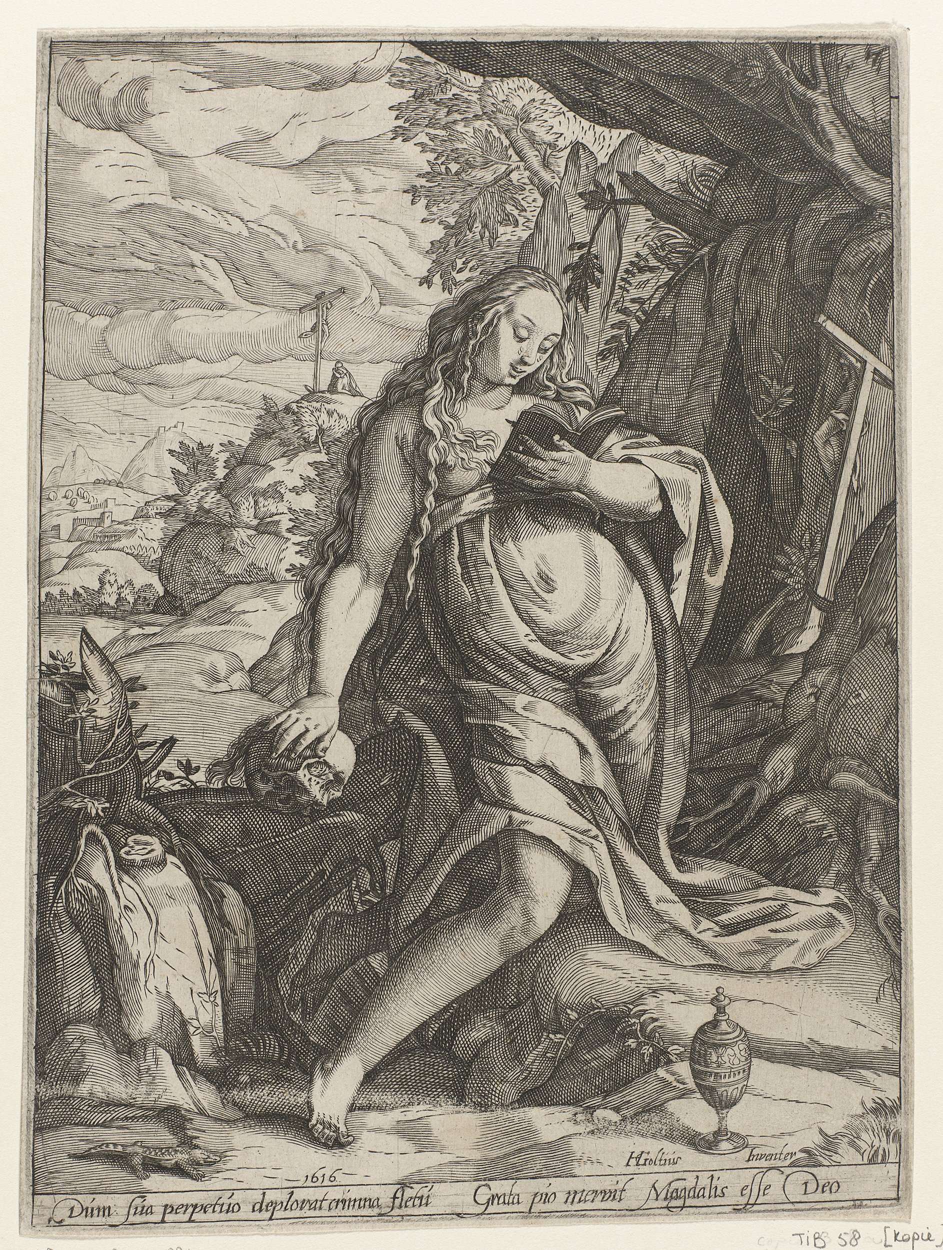 De Heilige Maria Magdalena, ten voeten uit, leunend op een schedel. Op de achtergrond links is Maria Magdalena nogmaals te zien, geknield onder Christus aan het kruis. Regel Latijn in marge onder prent.