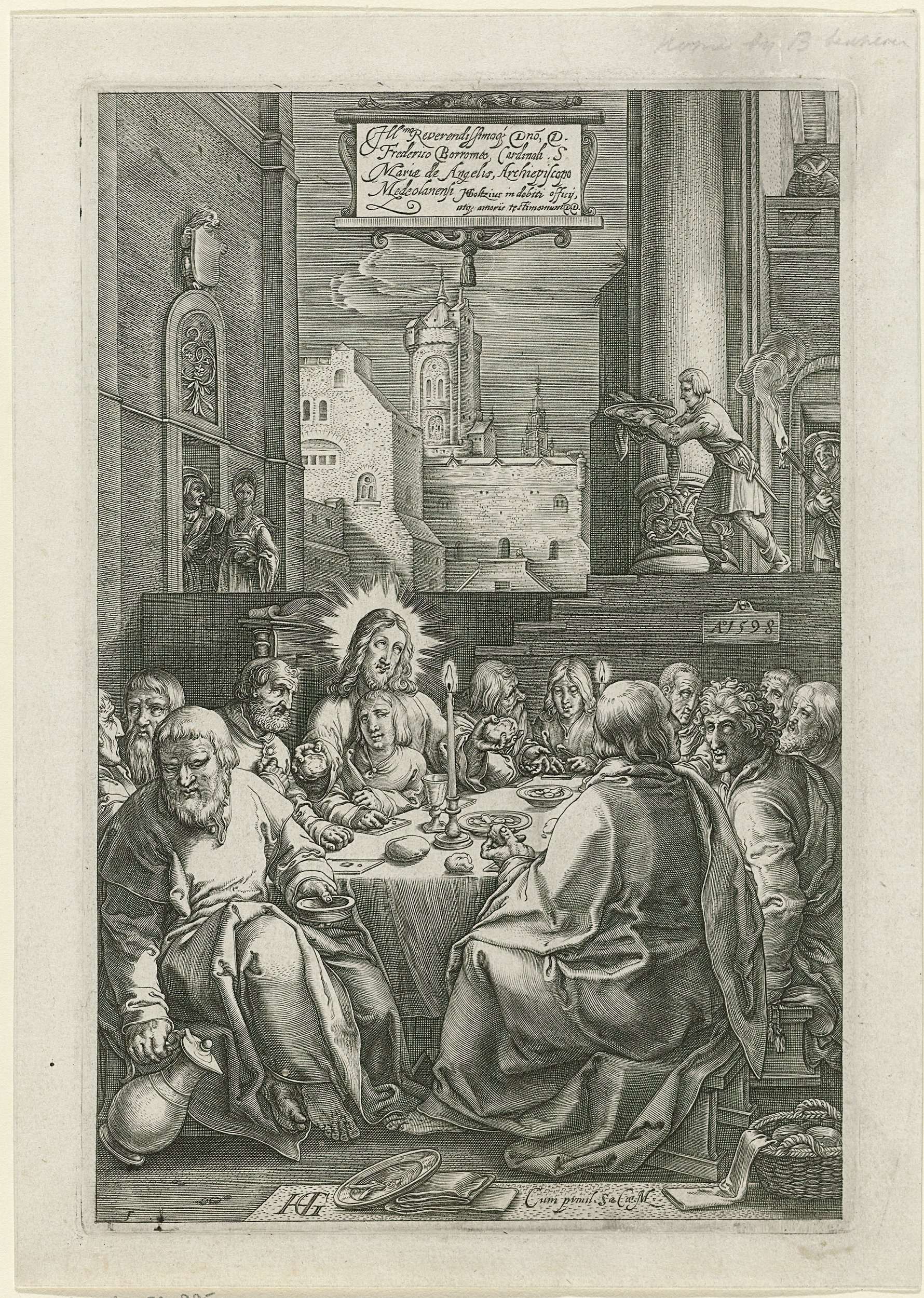 Christus gebruikt met zijn discipelen het Laatste Avondmaal in een architectonische omgeving. Deze prent is onderdeel van een serie van twaalf passievoorstellingen.