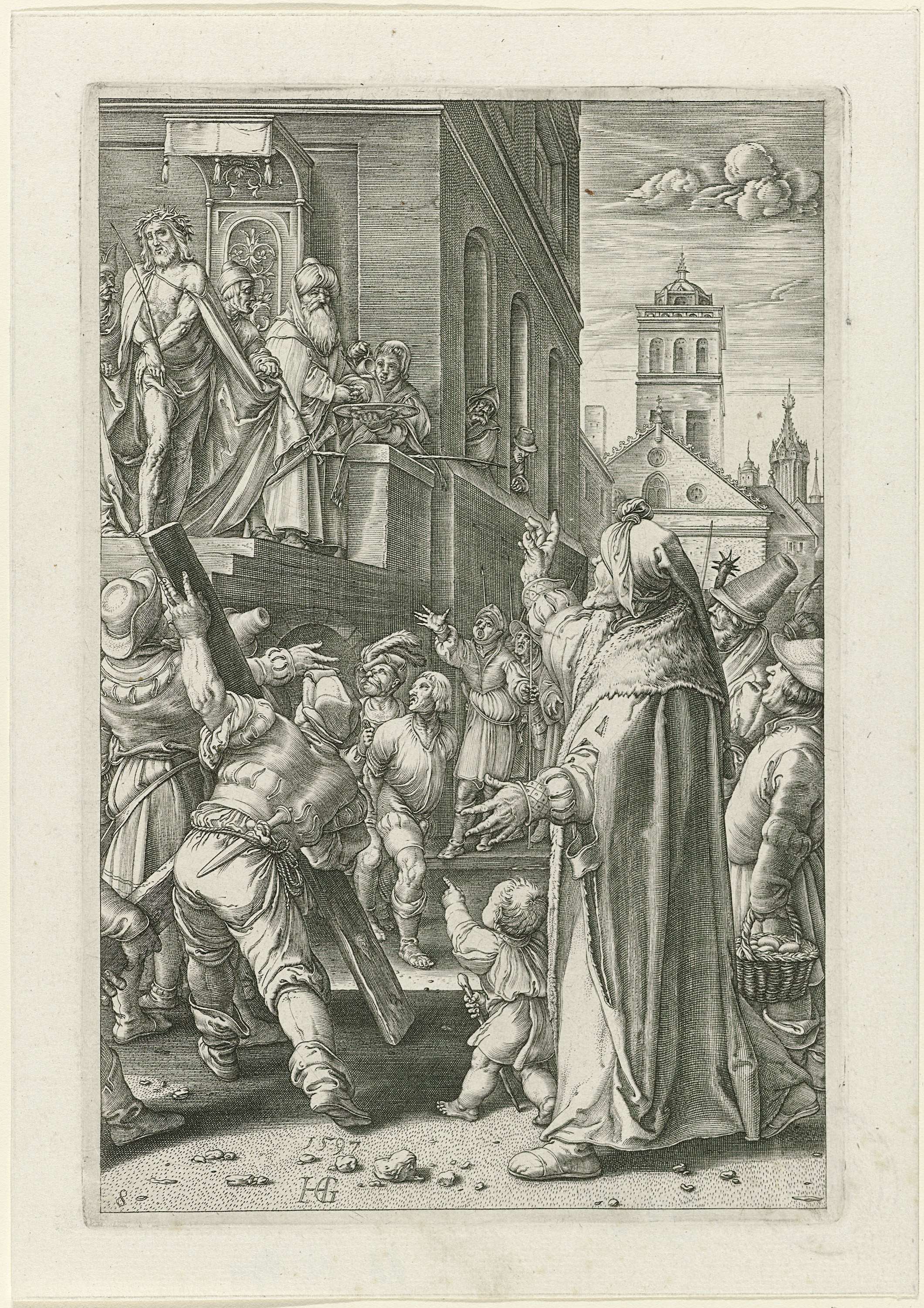 Christus wordt door Pilatus op een podium aan het volk getoond. Pilatus heeft aan het volk gevraagd of hij Christus of Barabbas zal vrij laten. Het volk roept dat Barabbas moet worden vrijgelaten, wat in het midden gebeurt, en dat Christus moet worden gekruisigd. Pilatus wast zijn handen in onschuld.
