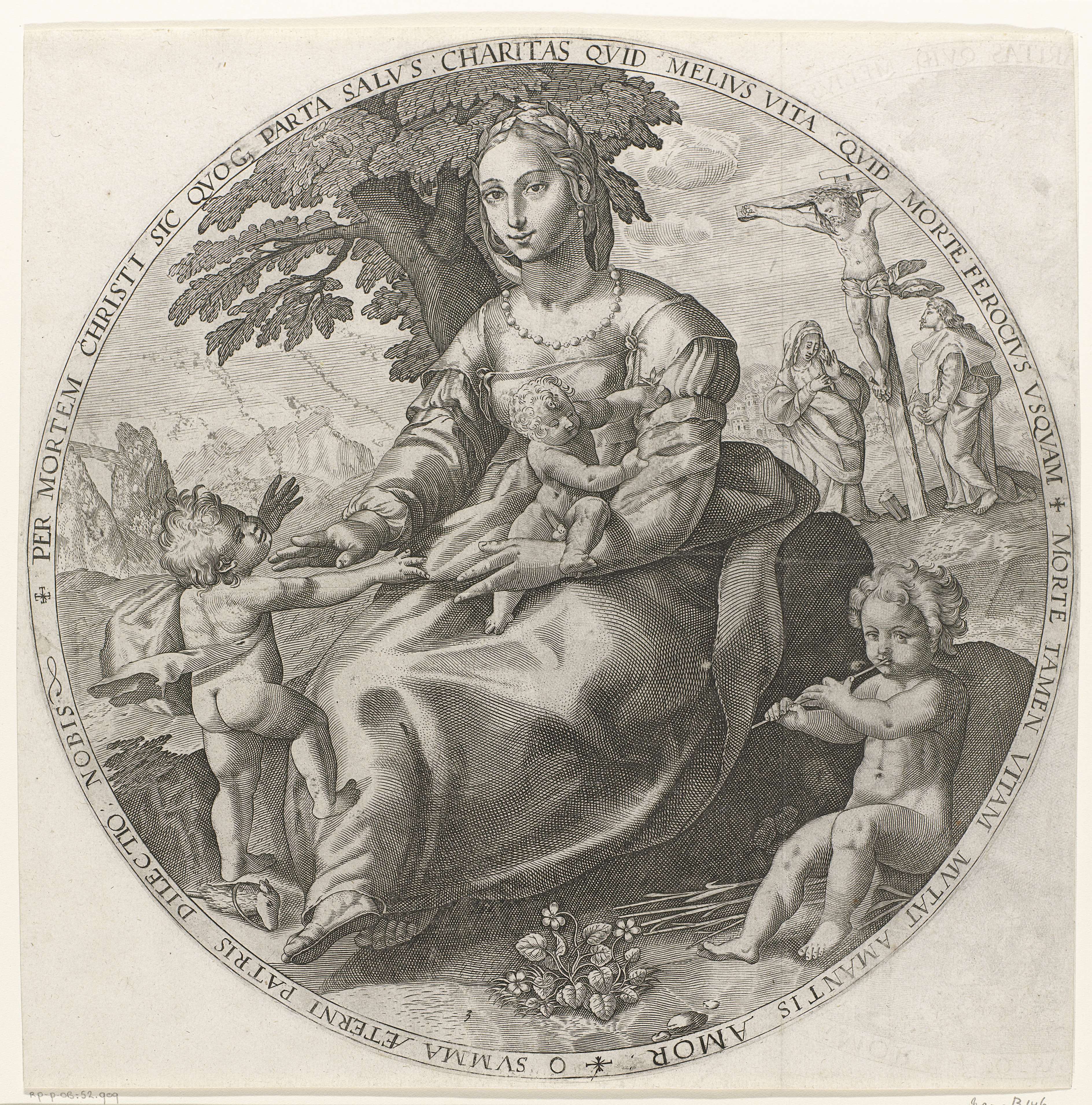 De personificatie van de Liefde, een van de drie goddelijke deugden, met drie kinderen zittend bij een boom. Rechts op de achtergrond Christus aan het kruis geflankeerd door Maria en Johannes. Om de voorstelling een randschrift in het Latijn.