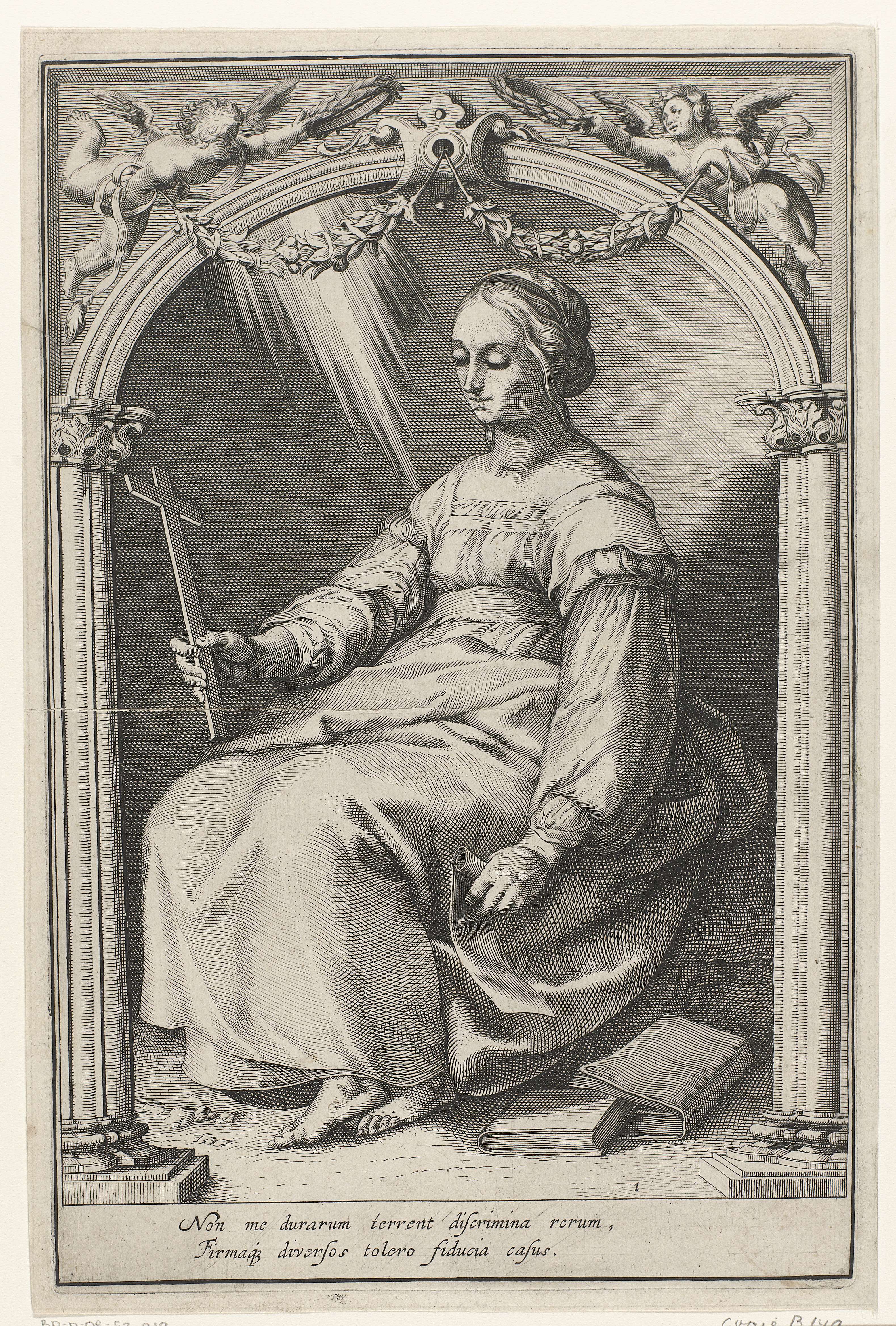 De personificatie van het Geloof, een van de drie goddelijke deugden, met een kruis in de hand. Naast haar liggen boeken. De voorstelling wordt omvat door een ornamentele boog met putti met lauwerkransen en guirlandes. Onder de voorstelling een tweeregelige tekst in het Latijn.
