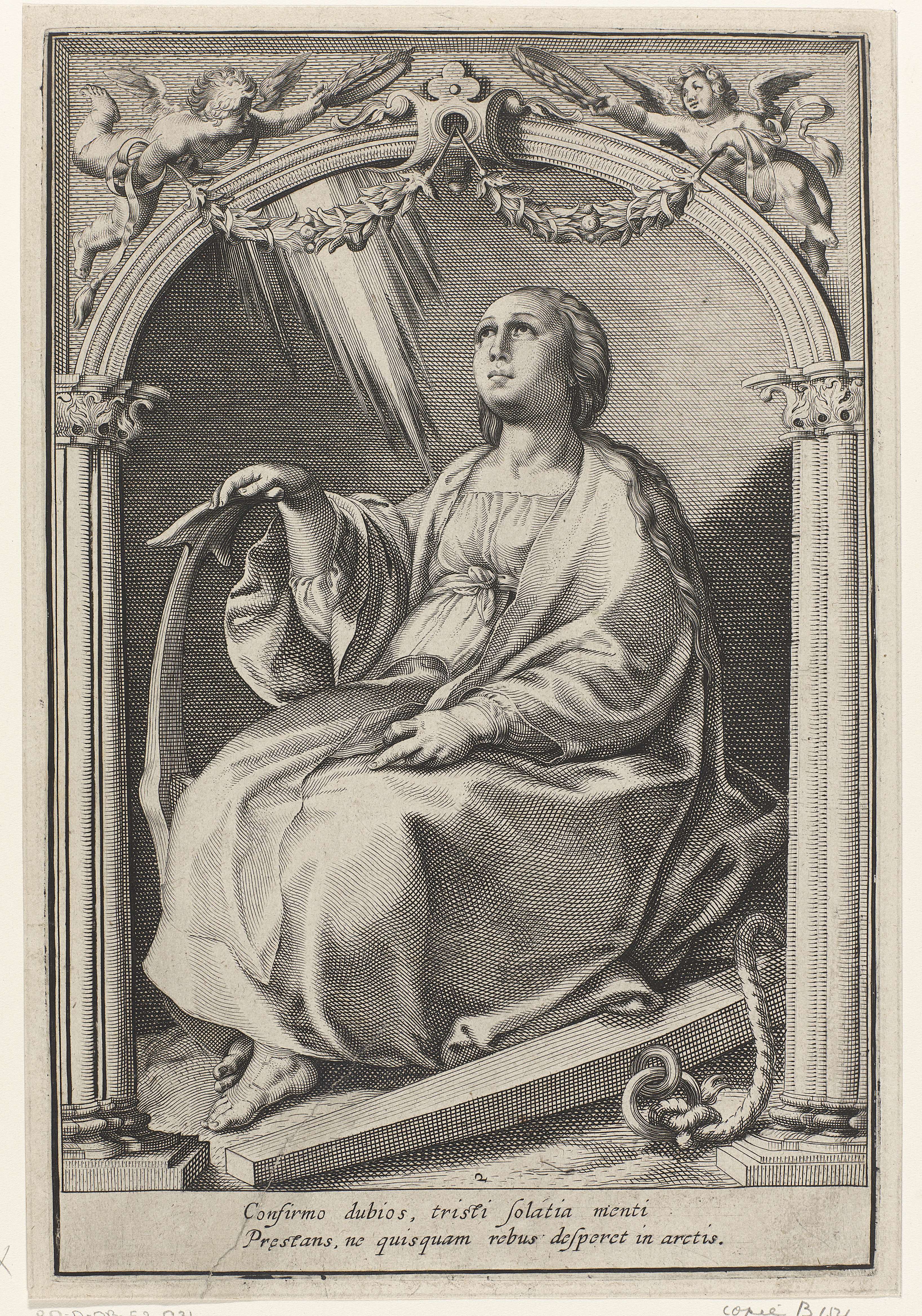 De personificatie van de Hoop, een van de drie goddelijke deugden, kijkt op naar de hemel rustend op een anker. De voorstelling wordt omvat door een ornamentele boog met putti met lauwerkransen en guirlandes. Onder de voorstelling een tweeregelige tekst in het Latijn.
