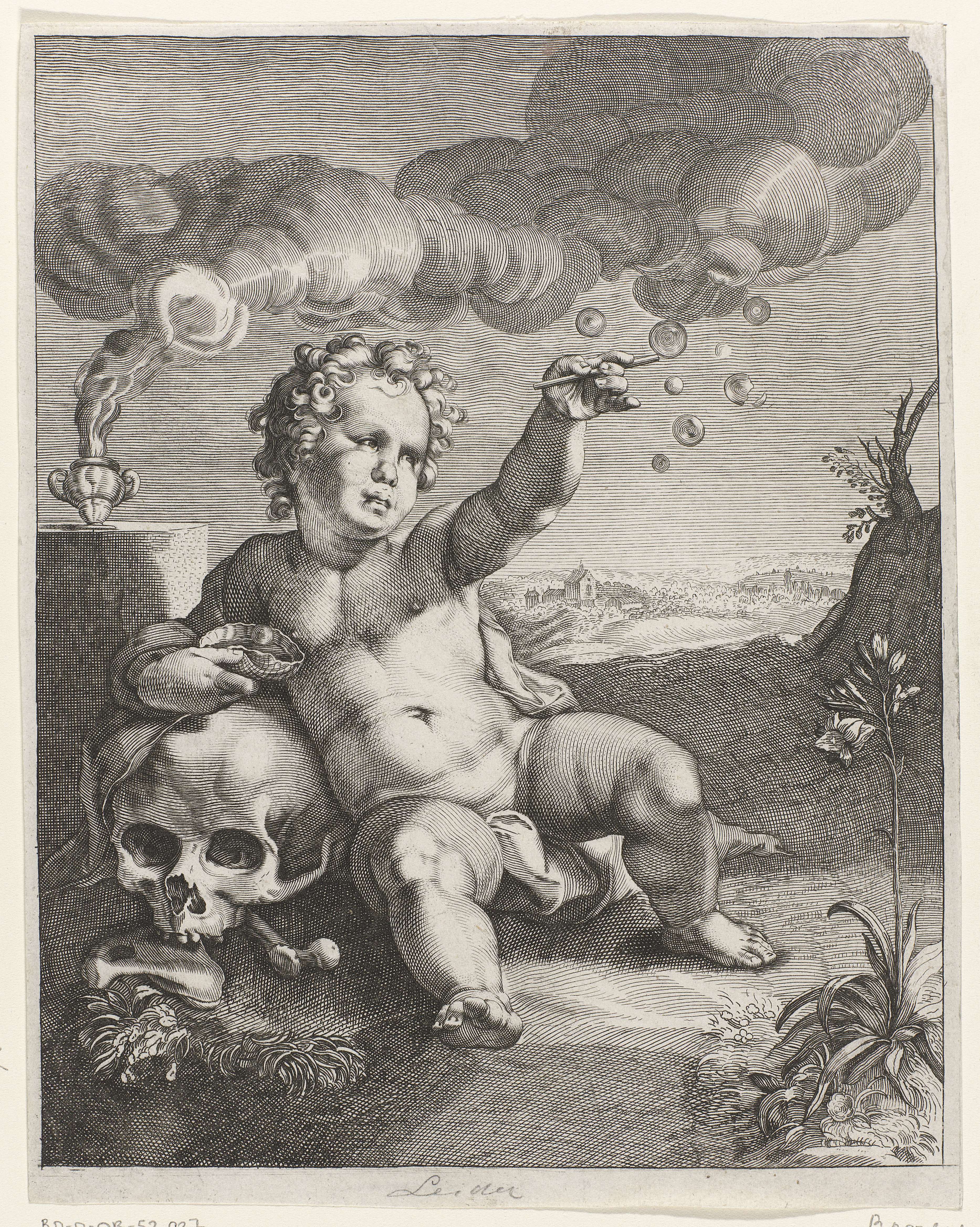 Een putto zit op de grond en leunt tegen een schedel, terwijl hij in zijn linkerhand een pijpje houdt waarmee hij bellen heeft geblazen. In zijn rechterhand houdt hij een schelp, Achter hem wierrookvat waaruit rook opstijgt.