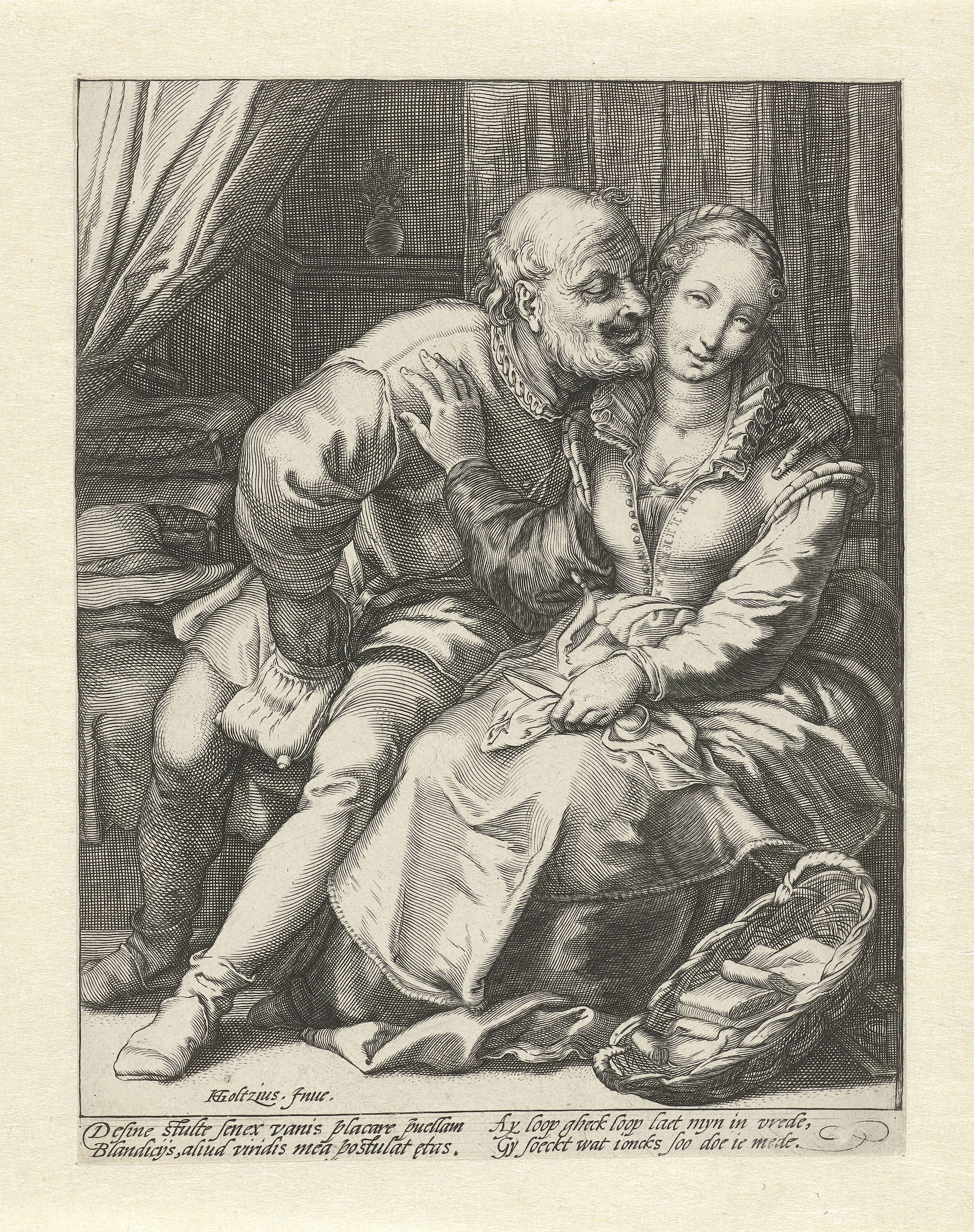 Een oude man zit op een stoel en tast in zijn geldbuidel. Naast hem een jonge vrouw op een stoel. De oude man probeert de vrouw te kussen, maar zij draait zich weg van hem en houdt hem tegen. De prent heeft een Latijns en Nederlands onderschrift