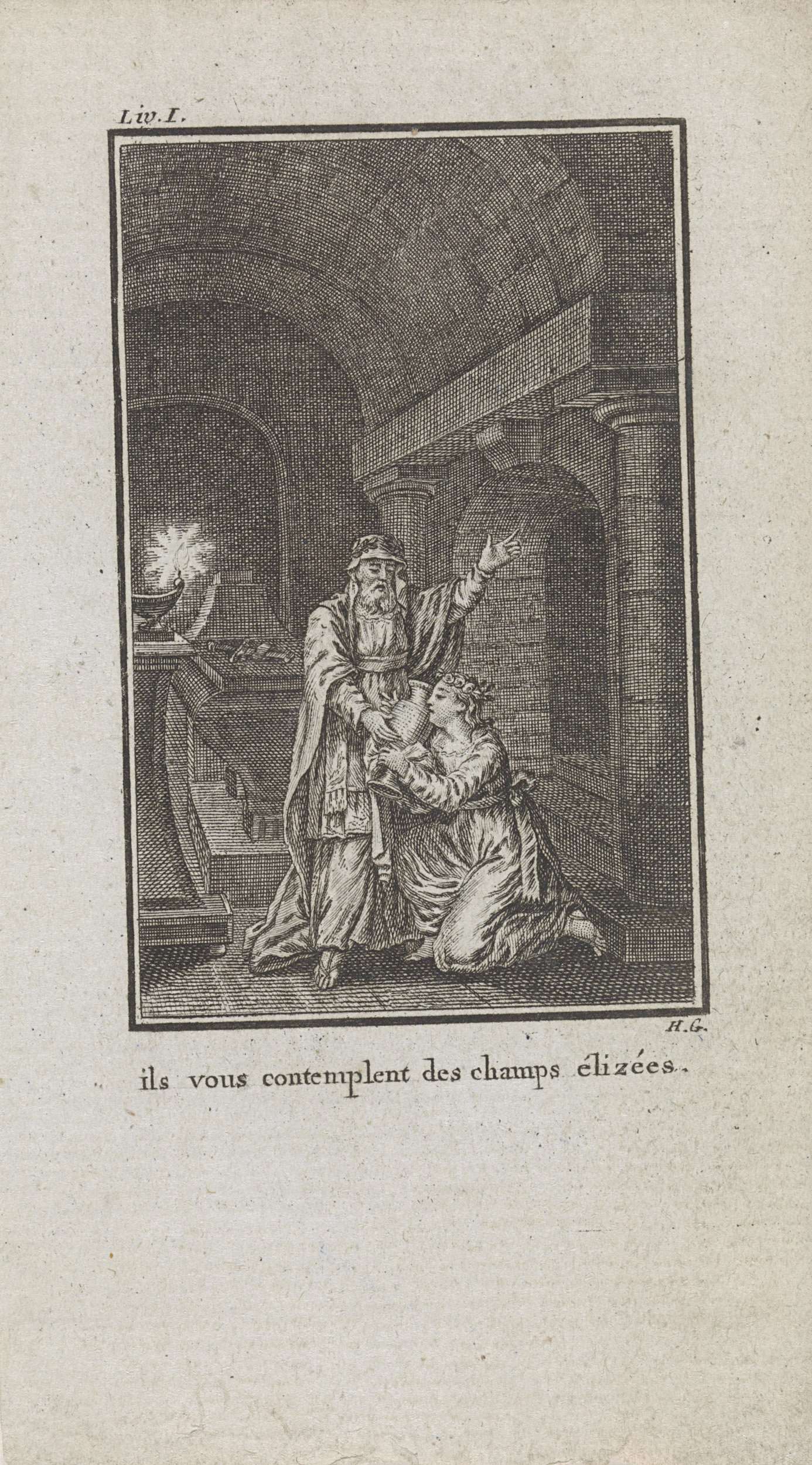 Numa knielt en kust de urn van zijn moeder in de grafkelder van zijn ouders, terwijl de hogepriester Tullus over hun leven vertelt. Met een Frans onderschrift.
