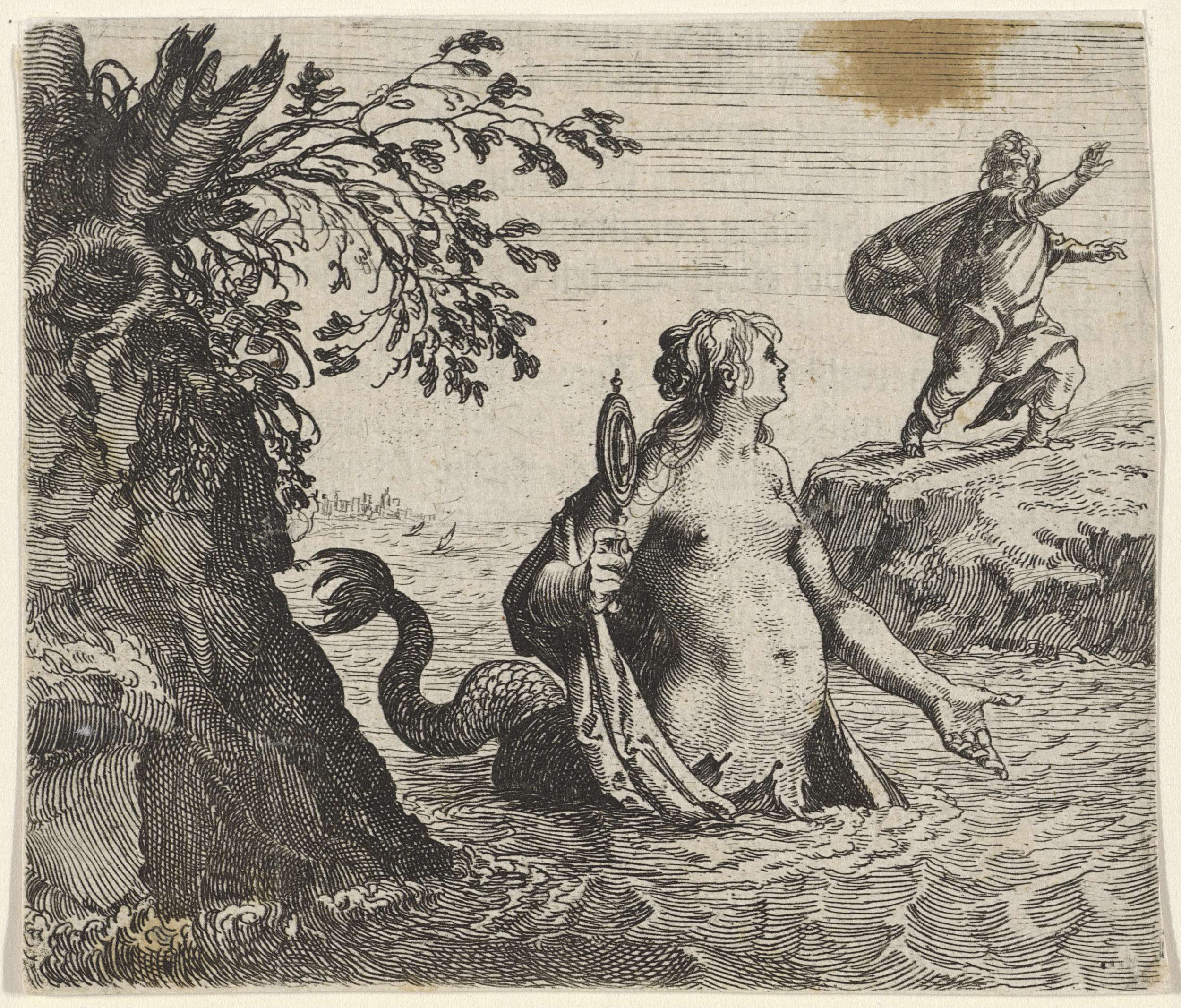 Een zeemeermin zwemt in zee en tracht een jongeling naar zich te lokken met haar gezang. In haar handen een spiegel.