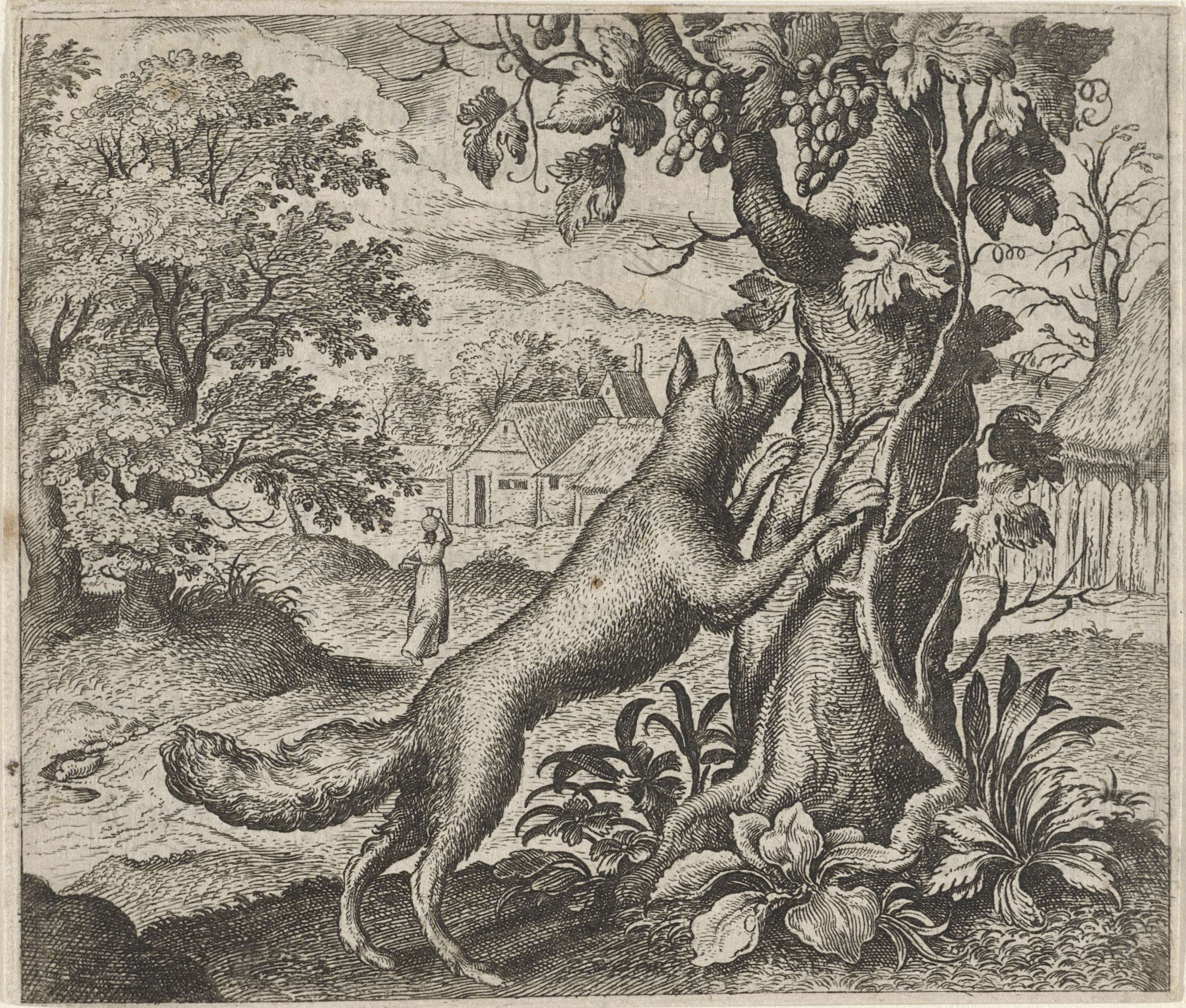 Een vos probeert de druiventrossen van een wijnstok te eten. De druiven hangen echter te hoog en de vos kan ze niet bereiken. De moraal van het verhaal leert dat iemand die iets begeert maar het niet kan bemachtigen, het begeerde goed later zal minachten.