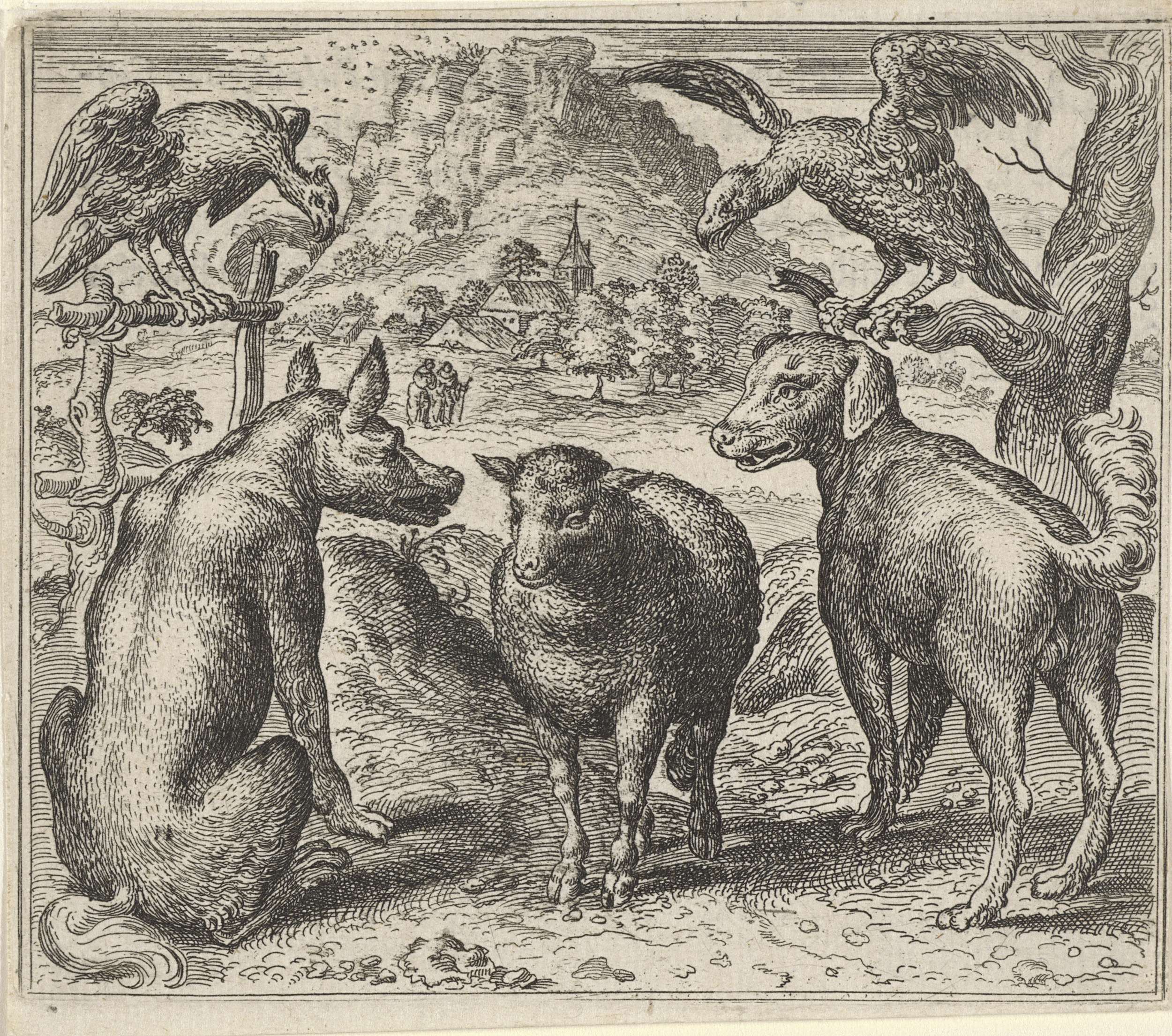De wolf heeft een rechtszaak aangespannen tegen het schaap. Rondom hem zijn getuigen: twee gieren en een hond. De fabel waarschuwt voor machtsmisbruik in het rechtssysteem.
