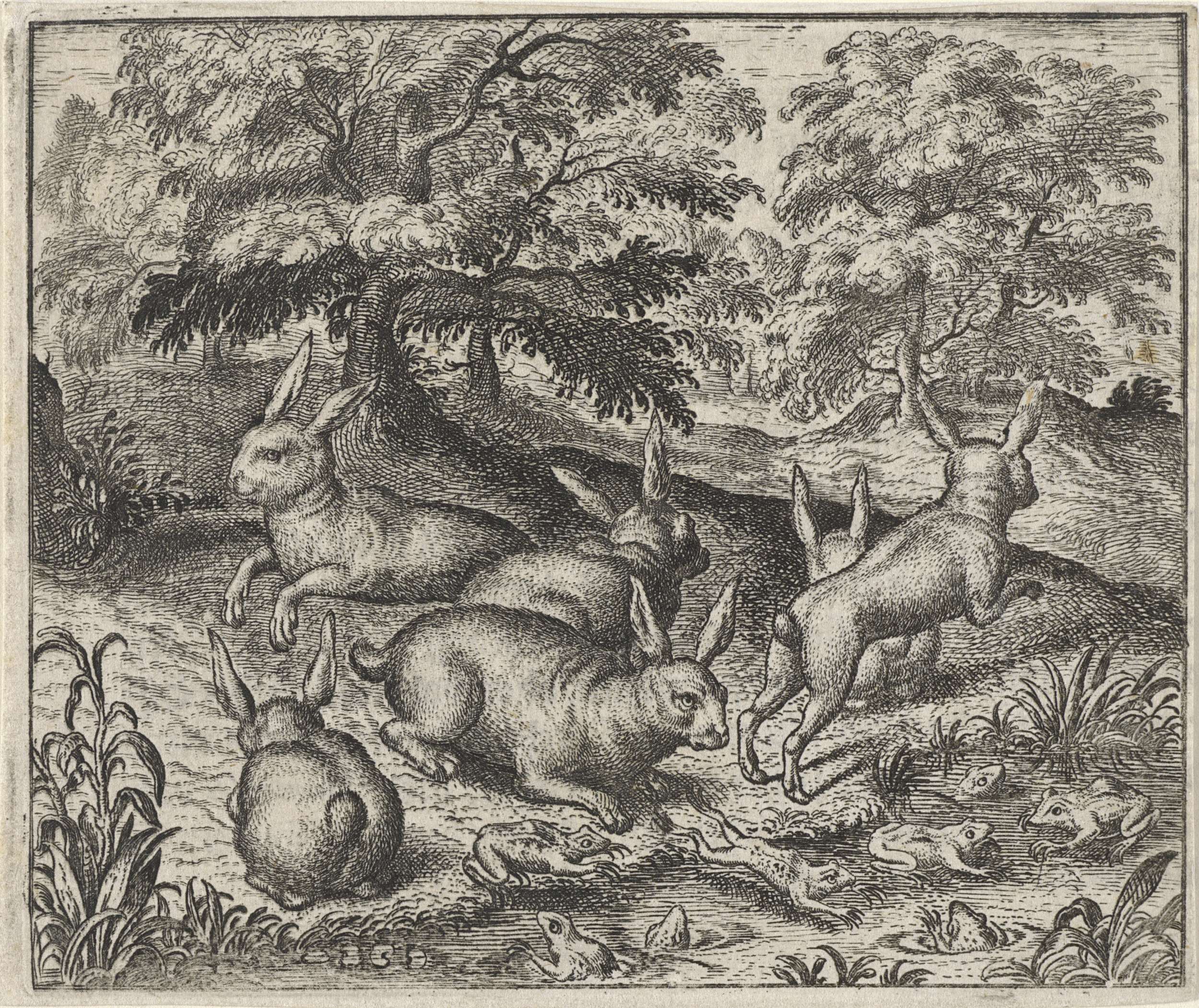 Zes hazen springen op en neer aan de oever van een beek, waarin kikkers zwemmen. De fabel verhaalt hoe op een keer de hazen werden opgeschrikt door de wind en van angst richting een beek renden. Door dit gedrag sprongen de kikkers in paniek het water in. Deze reactie gaf de hazen terug moed en ...