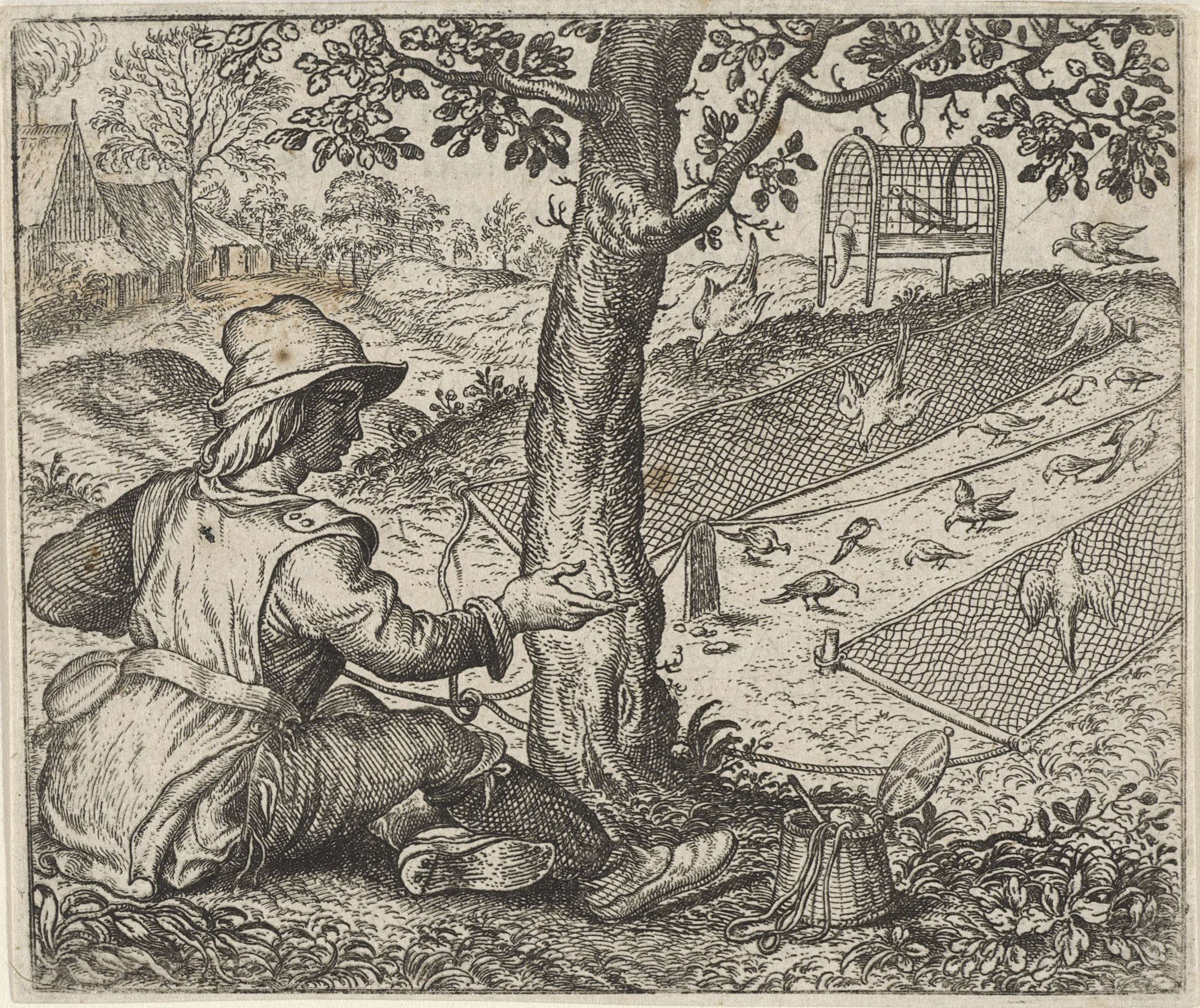 Op de voorgrond een vogelvanger, zittend onder een boom. Hij houdt de touwen vast waarmee hij de netten kan aantrekken. De man heeft te veel zaad gestrooid waardoor veel verschillende vogels op de netten voedsel oppikken. Daardoor kan hij de val niet dicht trekken. Het is beter je te concentreren op een zaak dan te ...