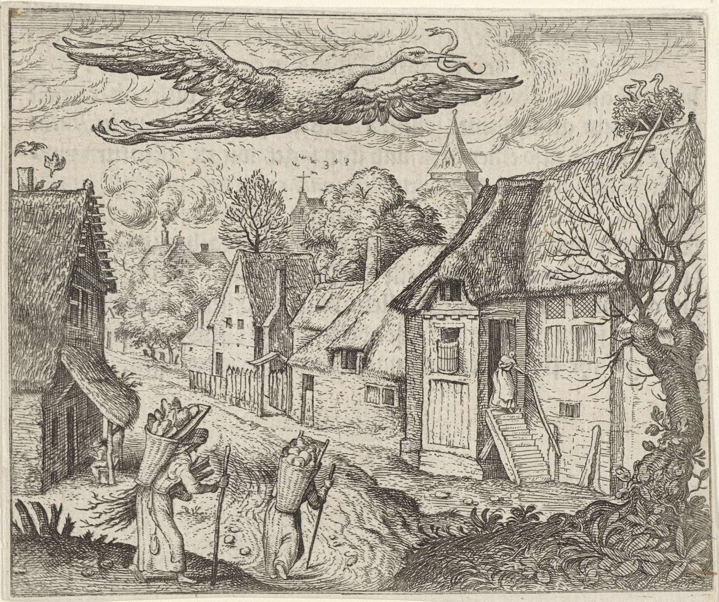 Een dorpsstraat met reizigers. In de lucht vliegt een ooievaar met een slang in zijn bek naar zijn nest met jongen. De fabel leert dat jongeren het voorbeeld van hun ouders volgen en looft de voordelen deugdzame opvoeding.