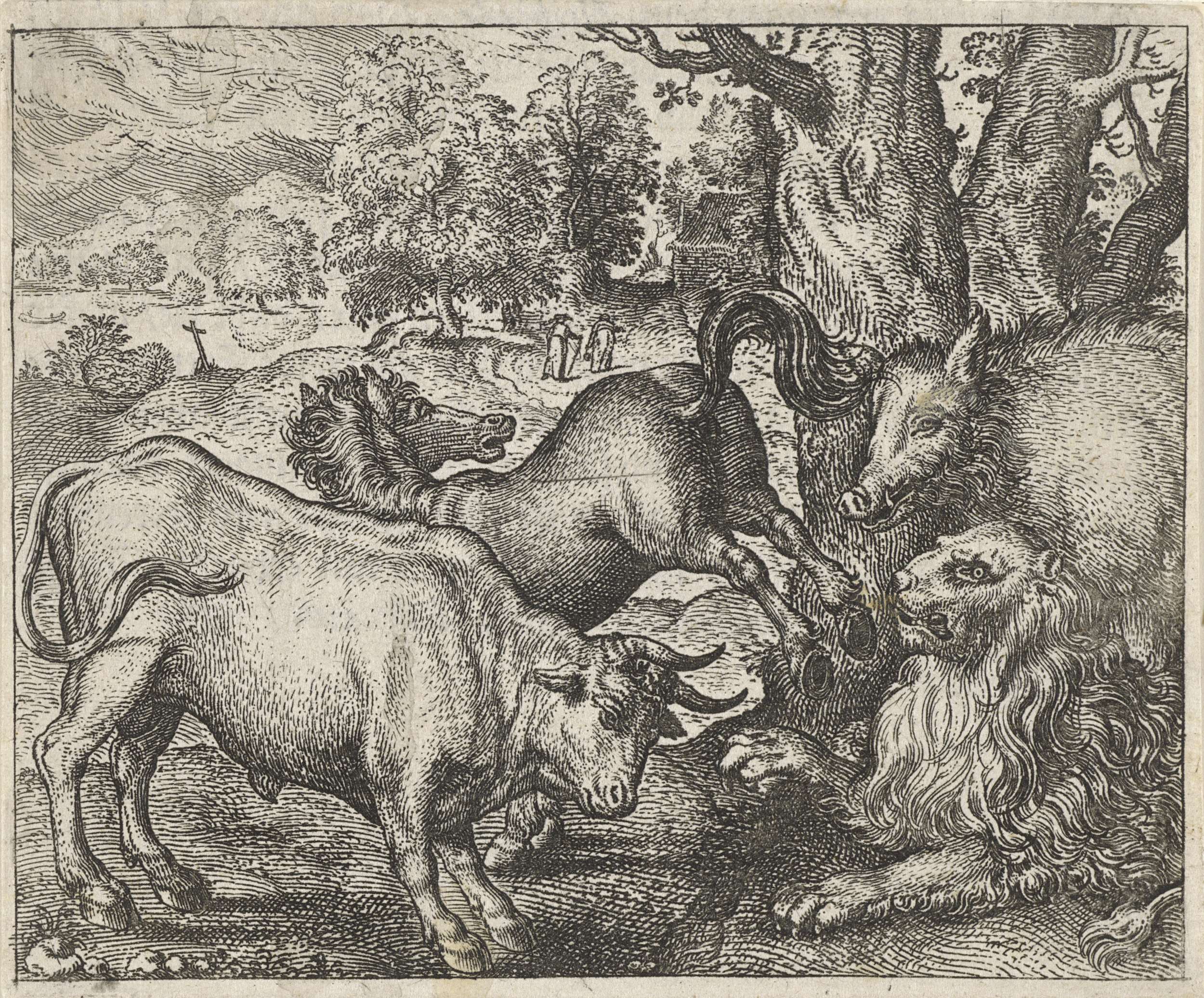 Een leeuw wordt door een varken, een stier en een paard belaagd. Het paard slaat hem met de achterpoten De fabel beschrijft hoe een oude hulpeloze leeuw door zijn vijanden wordt aangevallen. De moraal van het verhaal leert dat wie in zijn jeugd alleen maar vijanden heeft gemaakt, hier later de gevolgen van zal moeten ...