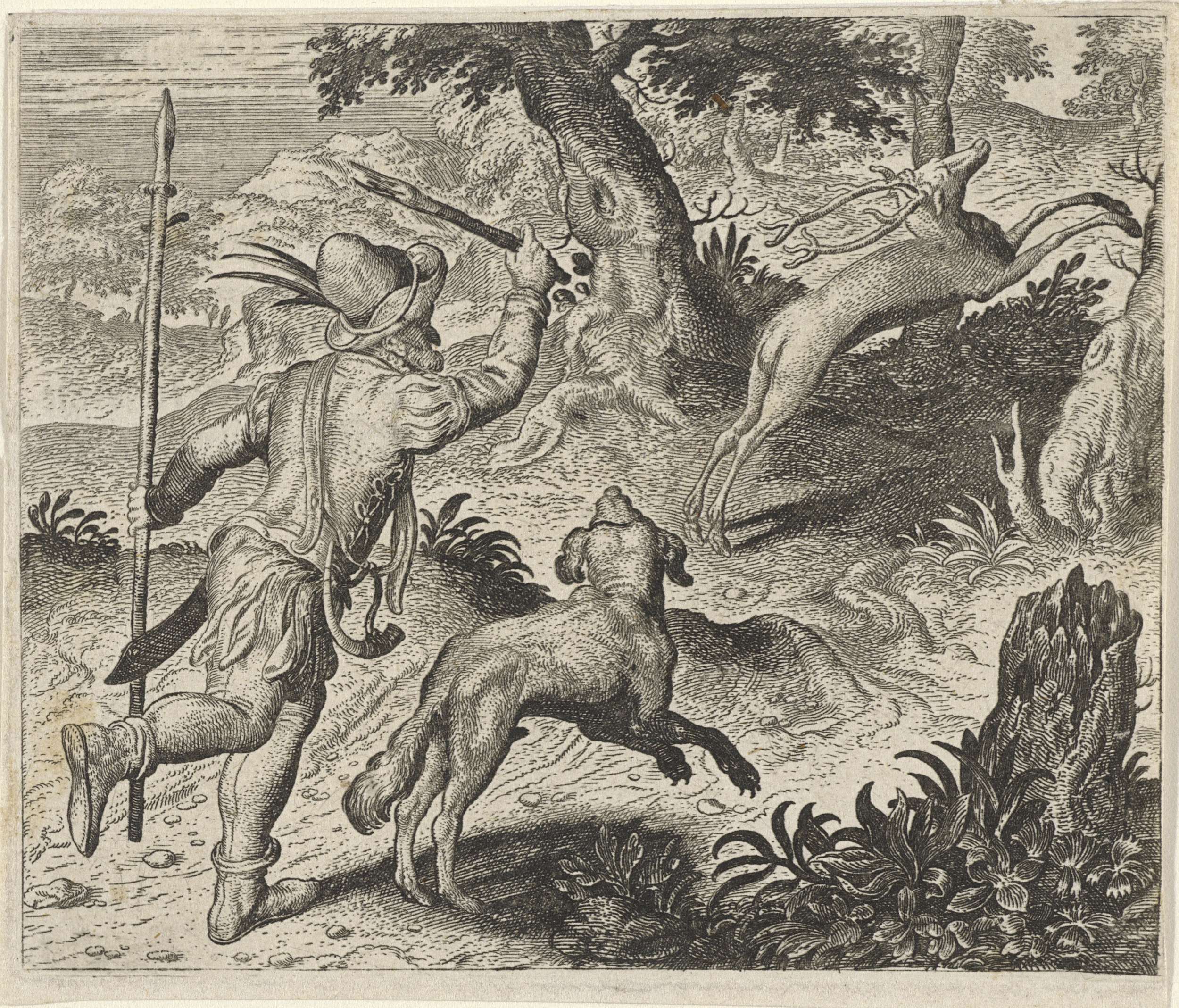 Een jager achtervolgt een hert samen met zijn hond. De fabel beschrijft hoe een oude hond niet meer op jacht kan gaan en daarom niet meer geliefd wordt. De moraal van het verhaal leert dat men loon naar werken krijgt.