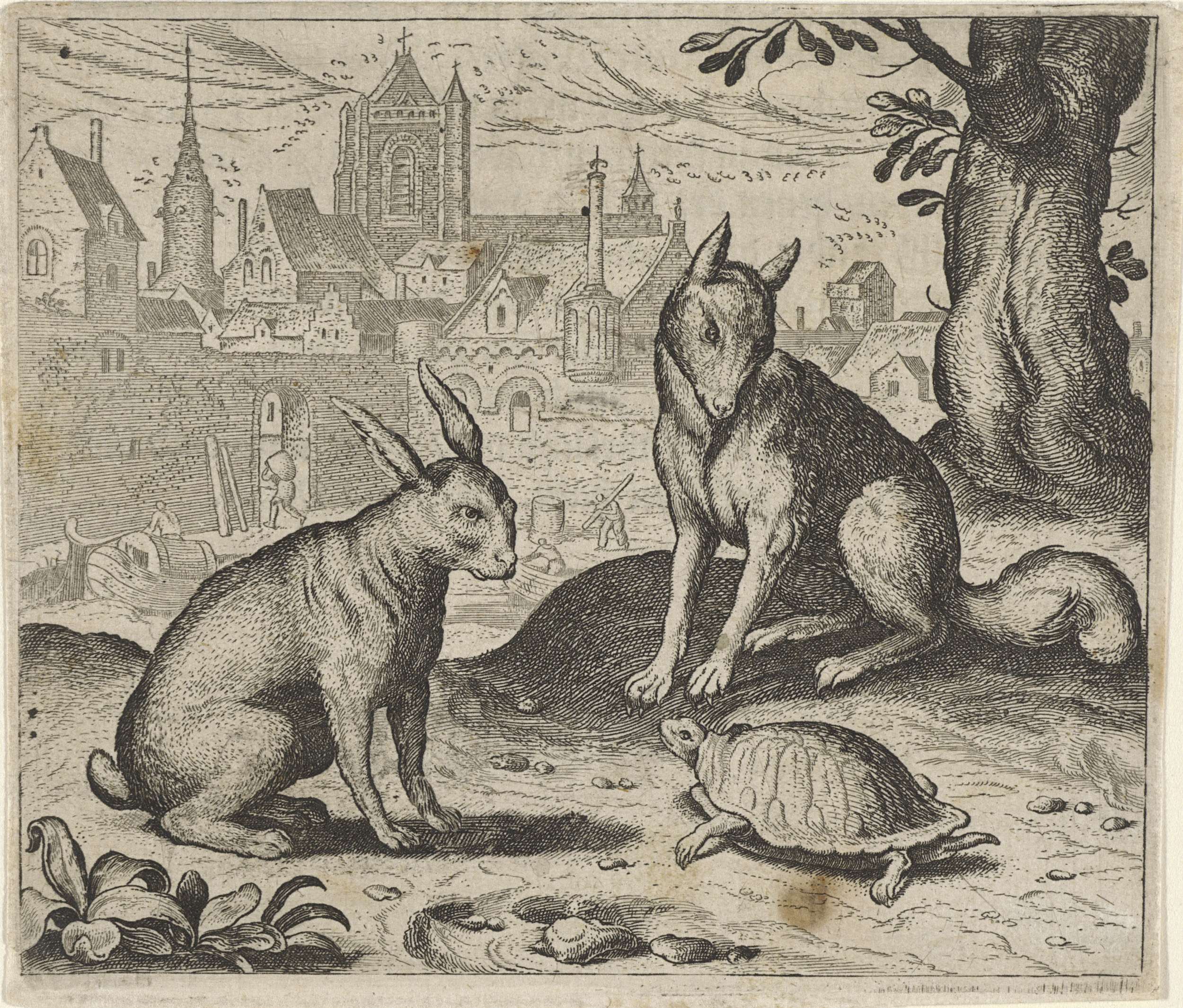 Een schildpad en een haas staan bij een vos. Op de achtergrond een stad. De fabel beschrijft de loopwedstrijd tussen de schildpad en de haas. De haas is veel sneller dan de schildpad. Hij waant zich al gewonnen en gaat rusten voordat hij de eindstreep heeft bereikt. De schildpad gaat traag vooruit maar heeft doorzettingsvermogen ...