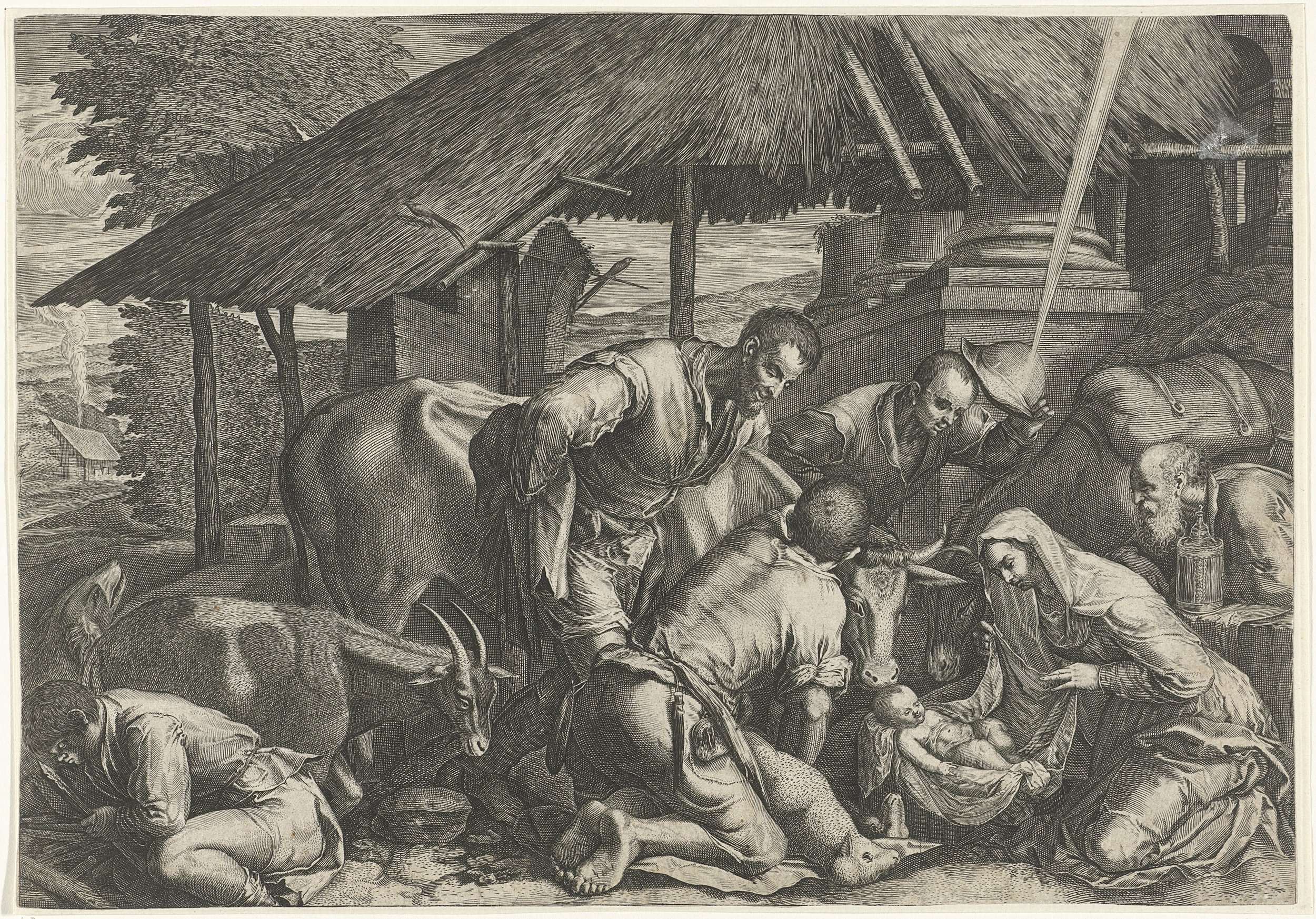 Rechts voor een stal met rieten dak Maria en Jozef samen met het Christuskind dat in de kribbe ligt. Drie herder eromheen. Rechts een slapende herdersjongen. Uit de hemel schijnt een zonnestraal met een Latijnse tekst op het Christuskind.