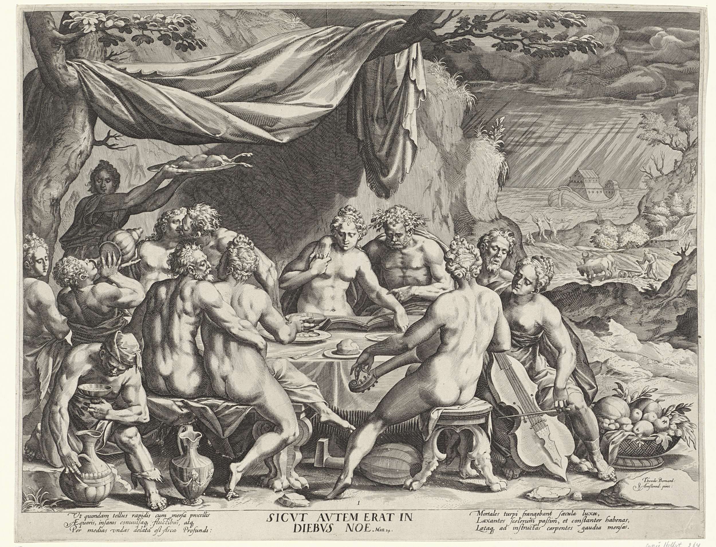 Een groep naakte mensen aan een gedekte tafel in de open lucht. Ze feesten, maken muziek, eten en plegen ontucht. Rechtsachter de zondvloed met de ark. De prent heeft een Latijns onderschrift met uitleg.