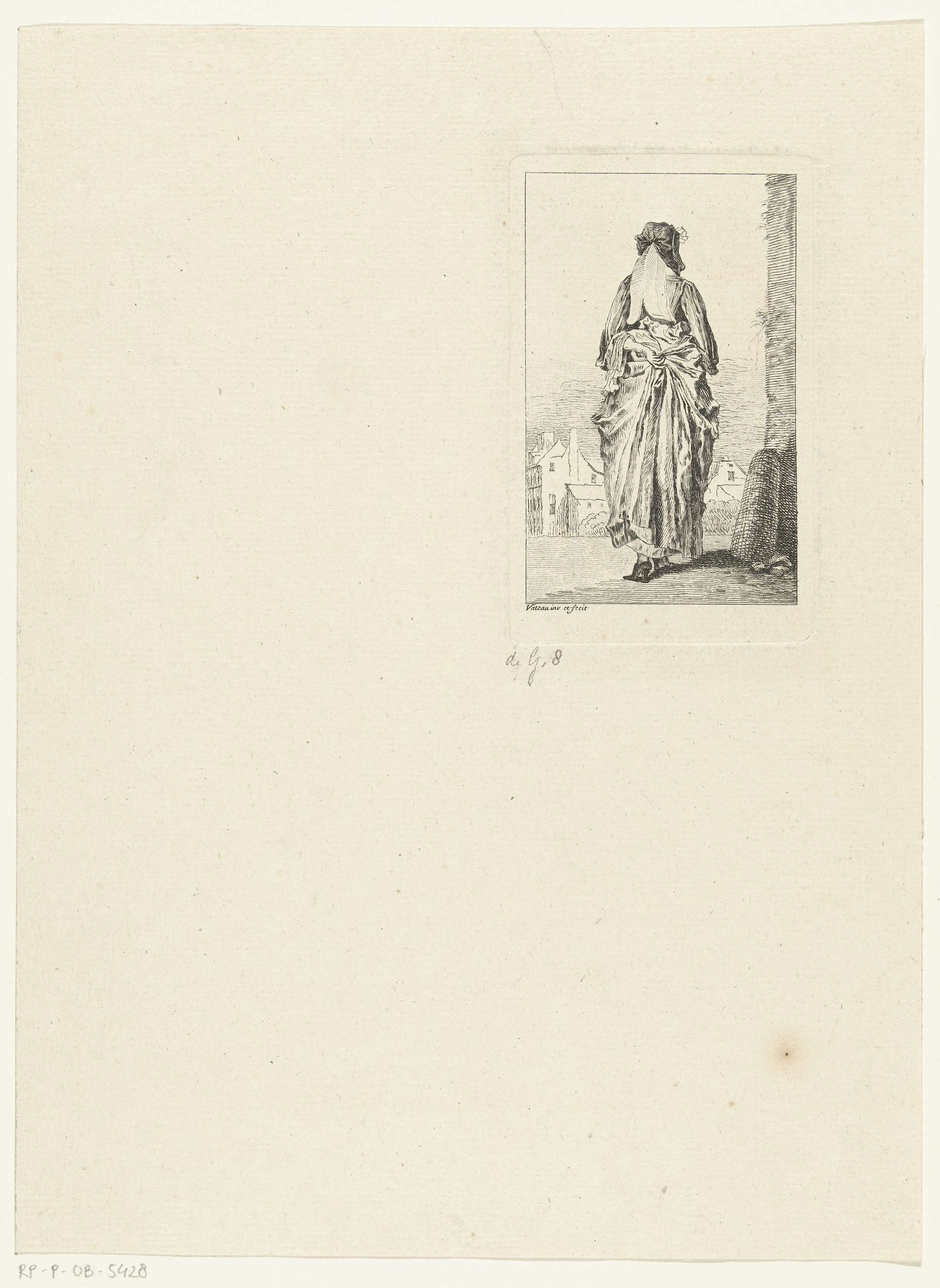 Vrouw op de rug gezien, lopend naast de muur van een huis, gekleed volgens de Franse mode van ca. 1710. Ze houdt haar japon van achteren met haar linkerhand op. Op haar hoofd een muts met twee 'barbes'. Uit een serie van acht prenten met figuren in verschillende kostuums.