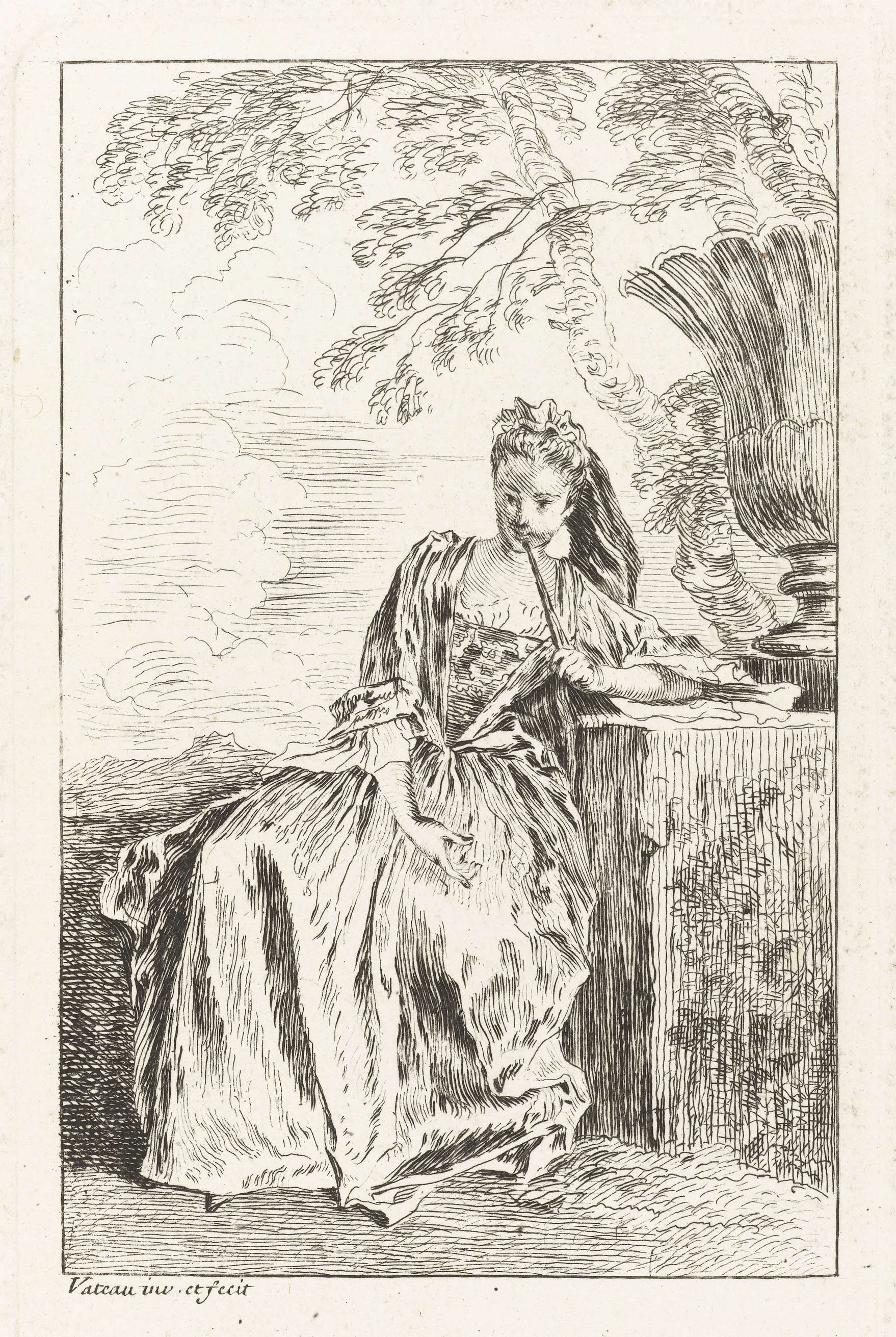 Zittende dame, leunend tegen een stenen sokkel met daarop een ornamentele vaas. Van voren gezien, een dichte waaier in de linkerhand. Gekleed volgens de Franse mode van ca. 1710. Uit een serie van acht prenten met figuren in verschillende kostuums.