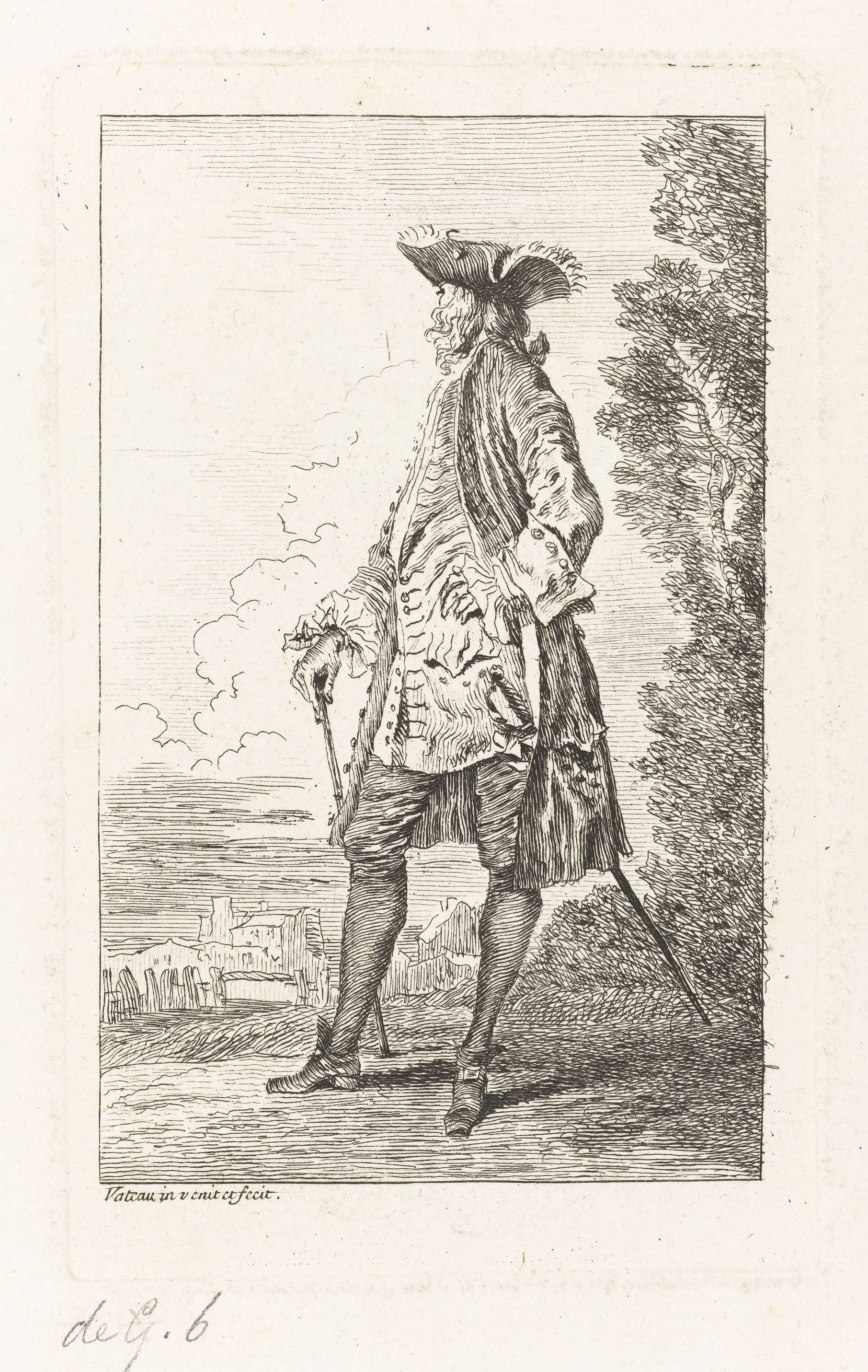 Een officier, naar links gekeerd en achter zich kijkend, staand in landschap met bomen. In zijn rechterhand een stok, linkszij hangt zijn degen. Uit een serie van acht prenten met figuren in verschillende kostuums.