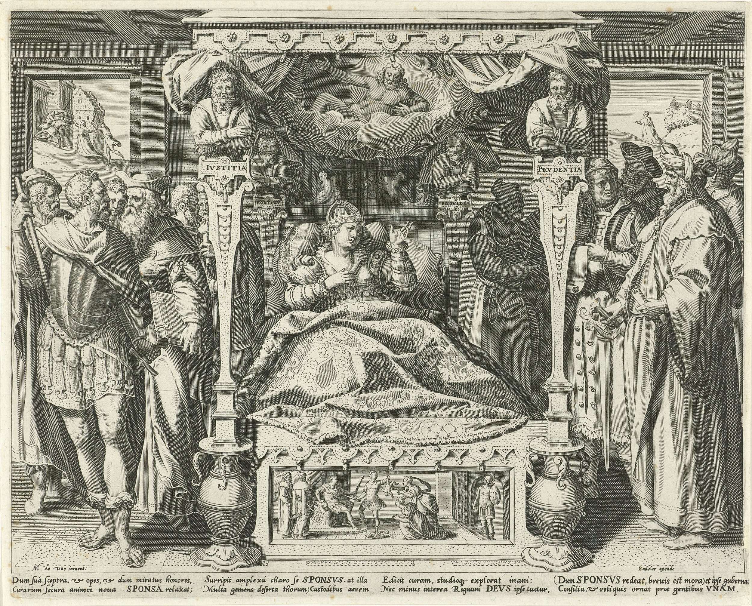 De bruid van Christus (de kerk) in een bed met een baldakijn. Het baldakijn wordt gedragen door de kardinale deugden. Op het voeteneind een voorstelling van het oordeel van Salomon. Boven het hoofd van de bruid Christus in een wolk. Rond het bed figuren uit het Oude Testament. Op de achtergrond door een deuropening is ...