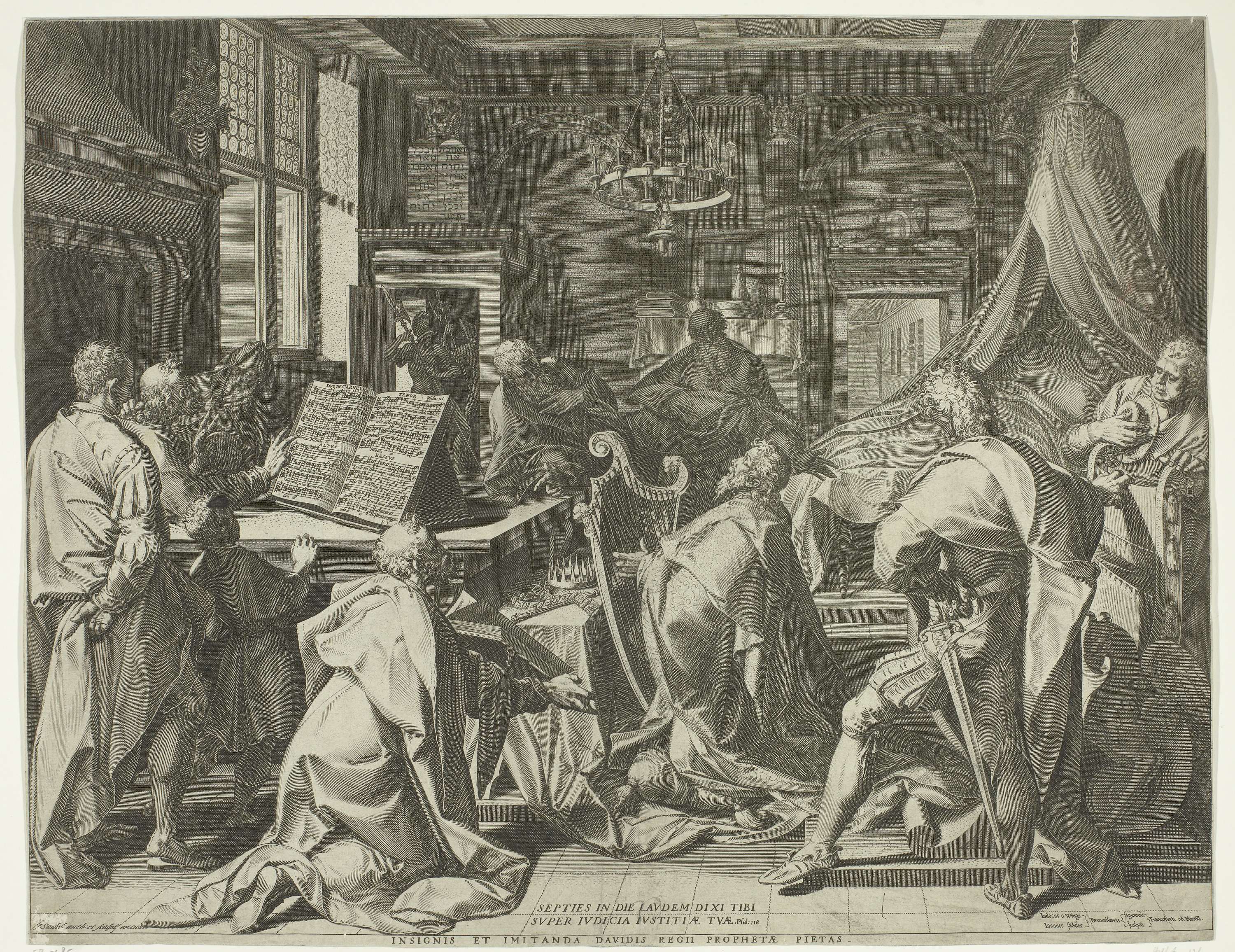 Koning David speelt op zijn harp, geknield in een vertrek. Op de tafel een open koorboek met het vijfstemmige motet 'Laude pia Dominum' (Psalm 118/119/164) van Andries Pévernage, gezongen door vijf mannen en jongens. Het motet is speciaal voor de prent gemaakt. De prent heeft een Latijns onderschrift met uitleg.