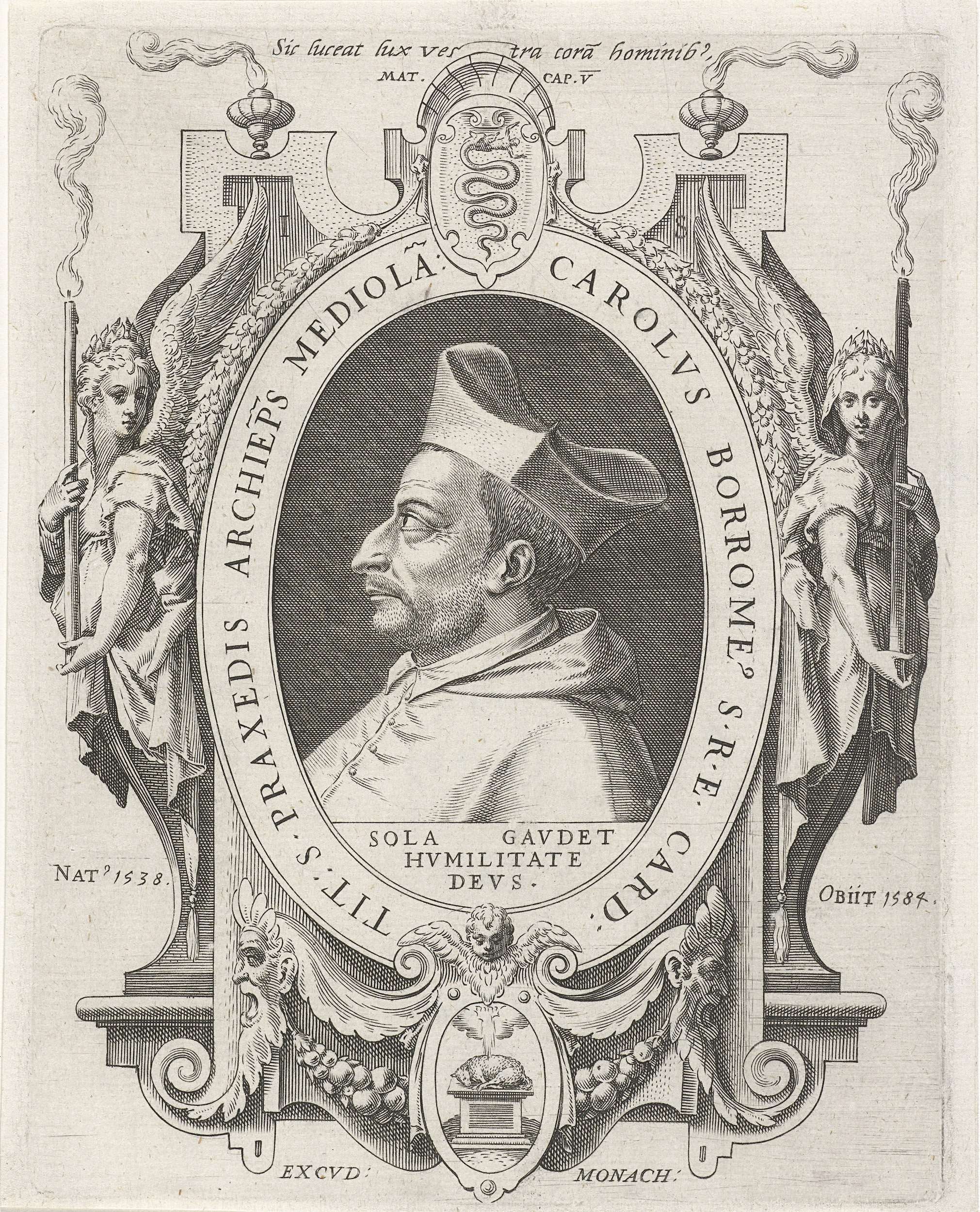 Portret in een ovale lijst van Carolus Borromeus. Hij draagt de biretta. De lijst is aan weerszijden versierd met een engel die een kaars draagt. Onder het portret een afbeelding van het Lam Gods. Boven het portret een afbeelding van een slang die een mens verslindt.
