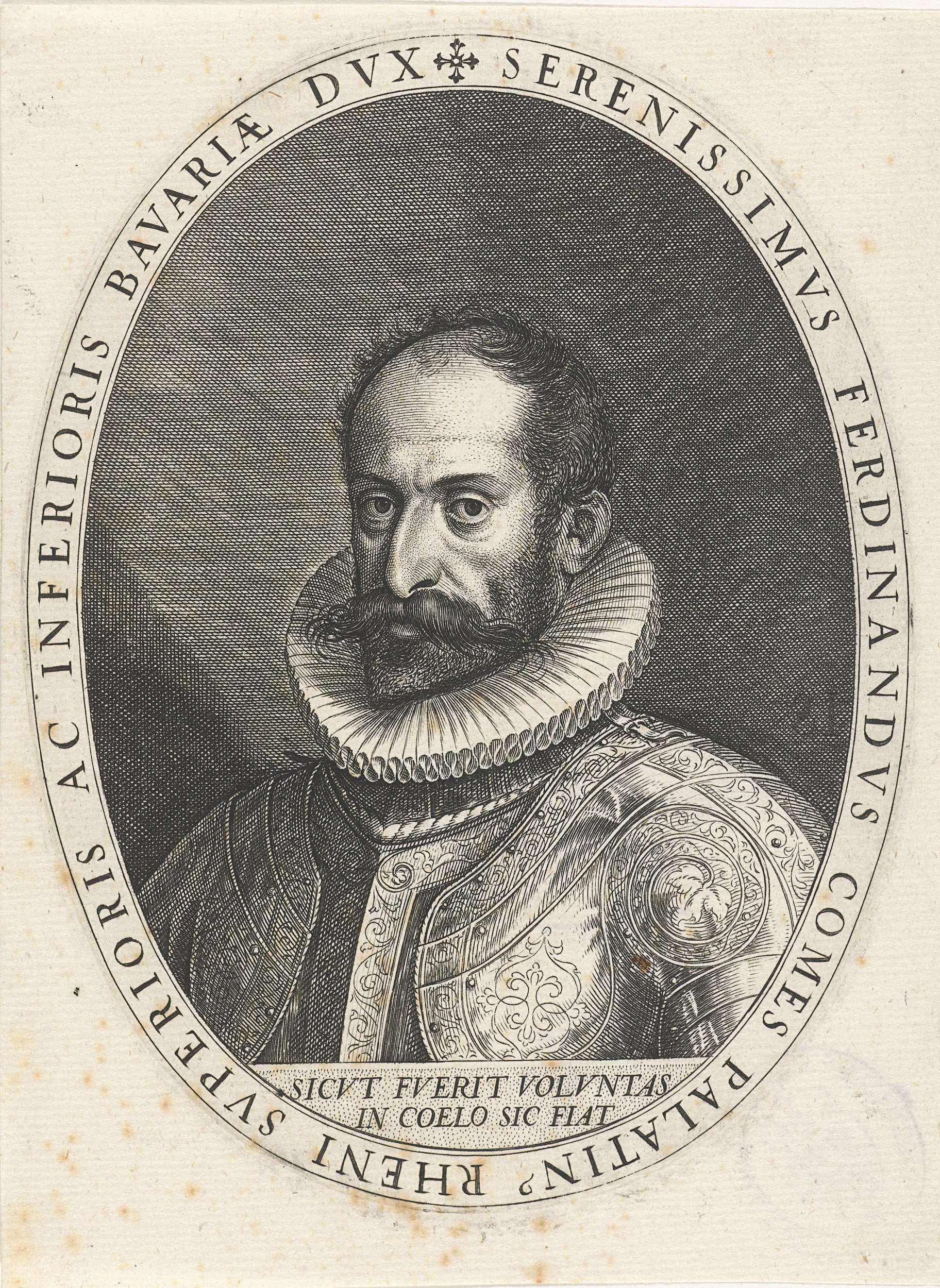 Ferdinand van Beieren, in harnas waarboven brede plooikraag. Breed uitstaande snor en puntbaardje. Buste naar links, in ovaal met randschrift. Aan de voet van het portret 2 regels onderschrift in Latijn: 'Sicut fuerit voluntas / in coelo sic fiat'.