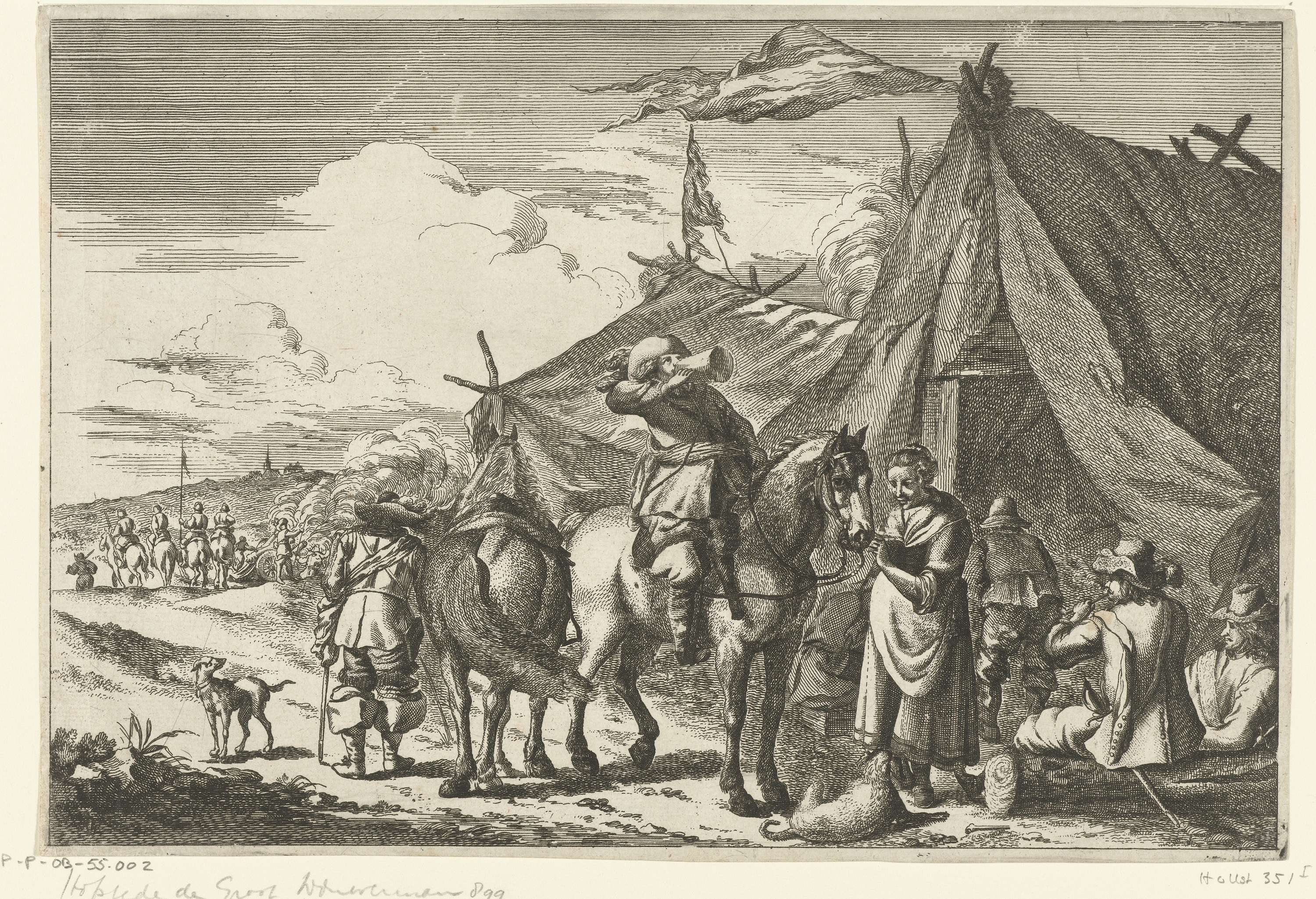Ruiters rusten bij tenten. In het midden een ruiter die op zijn paard uit een kruik drinkt. Rechts rokende soldaten. Links in de verte worden kanonnen afgeschoten.