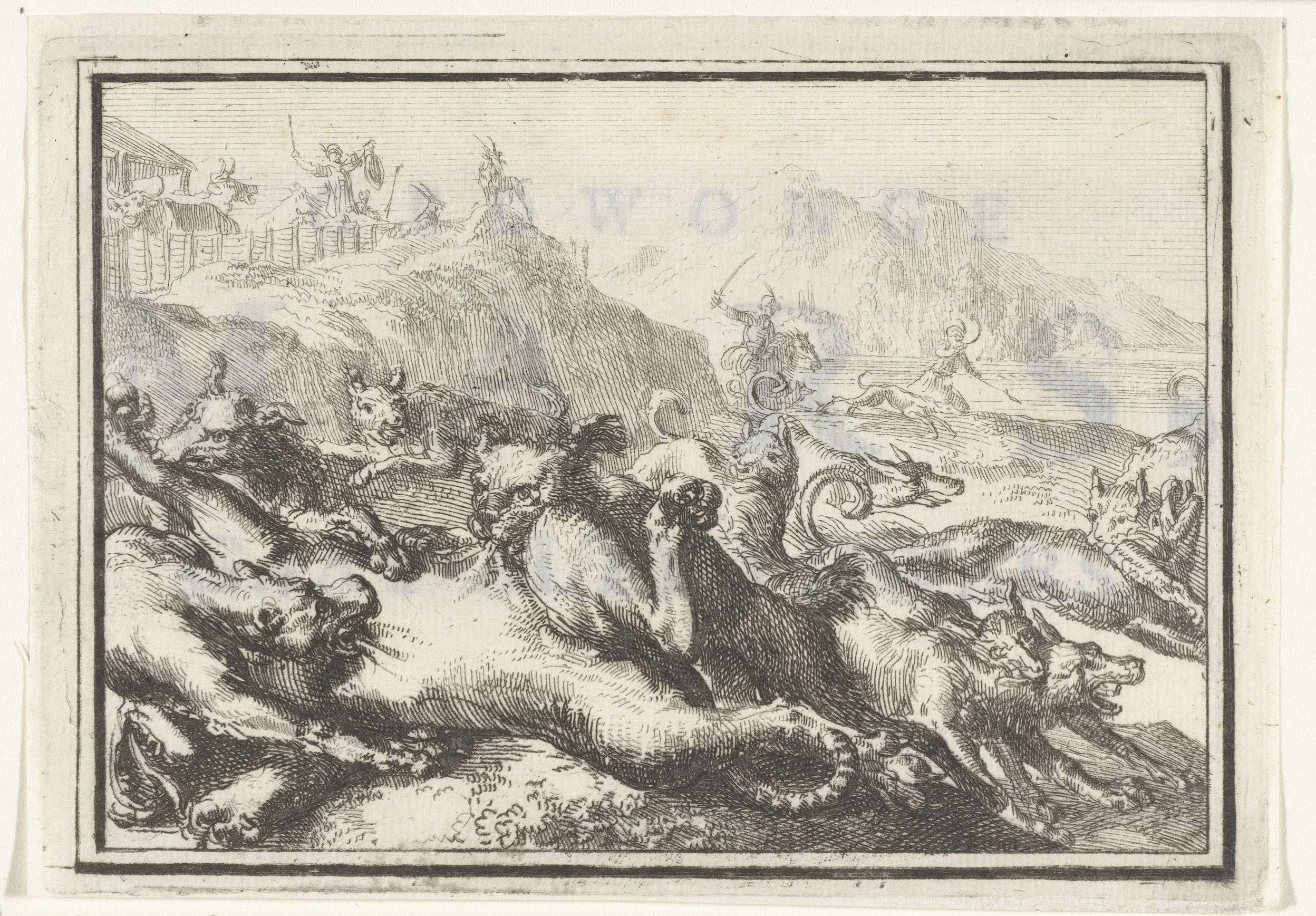 Vechtende dieren. Verbeelding van de fabel waarin de tijger en wolven honden dwingen om voor hen te roven maar uiteindelijk zelf door de honden worden verscheurd. Naar aanleiding van de dienstplicht zonder soldij in Frankrijk. Titel staat op apart tekstblad.