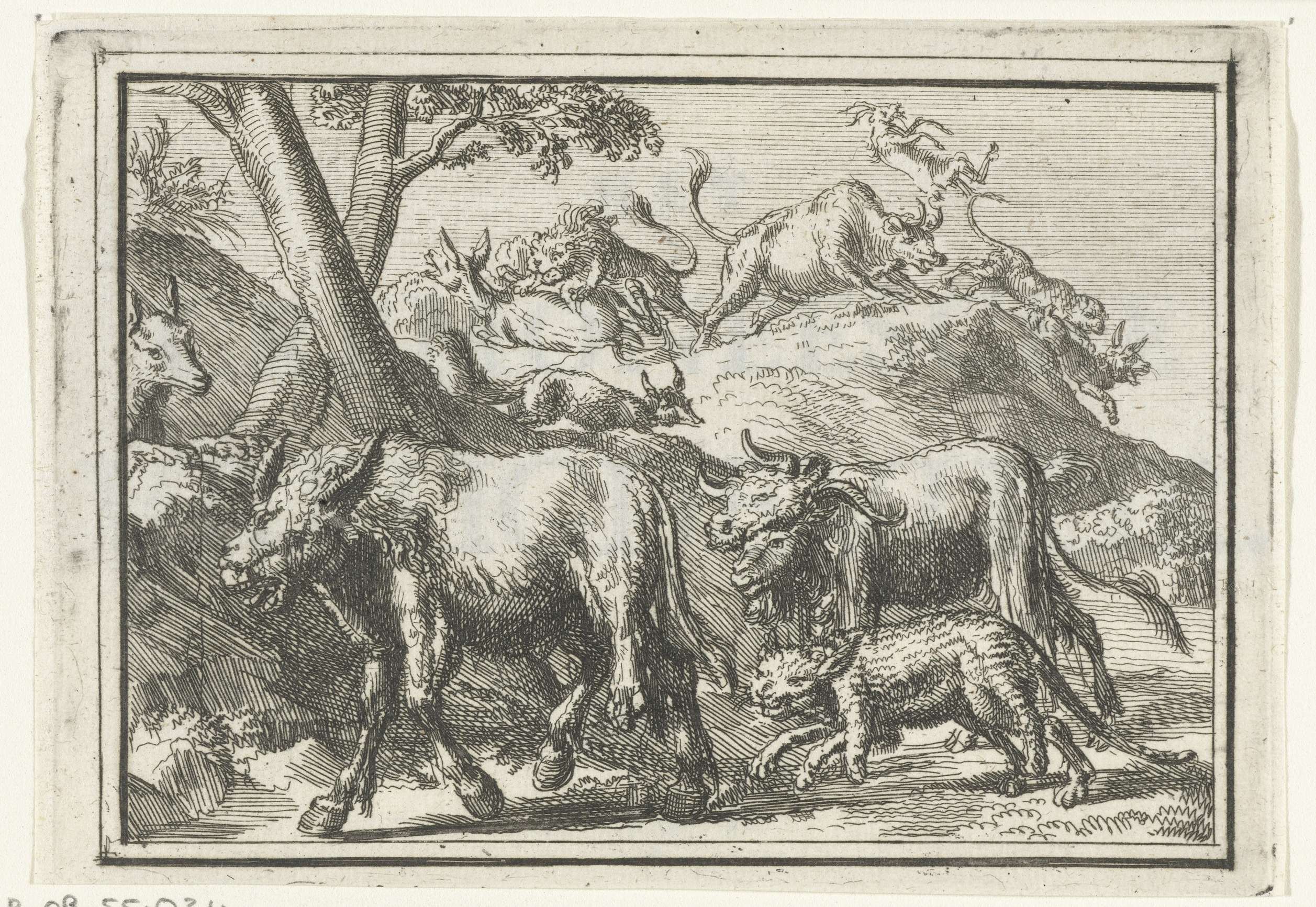 Fabel van de ezel die zich met de huid van een leeuw onherkenbaar maakt, een geit met de huid van een buffel en een haas met de huid van een kat. De dieren (Fransen) worden door de vos herkend en verraden en, op de achtergrond, door de echte dieren (de Geallieerden) verscheurd. Titel staat op ...