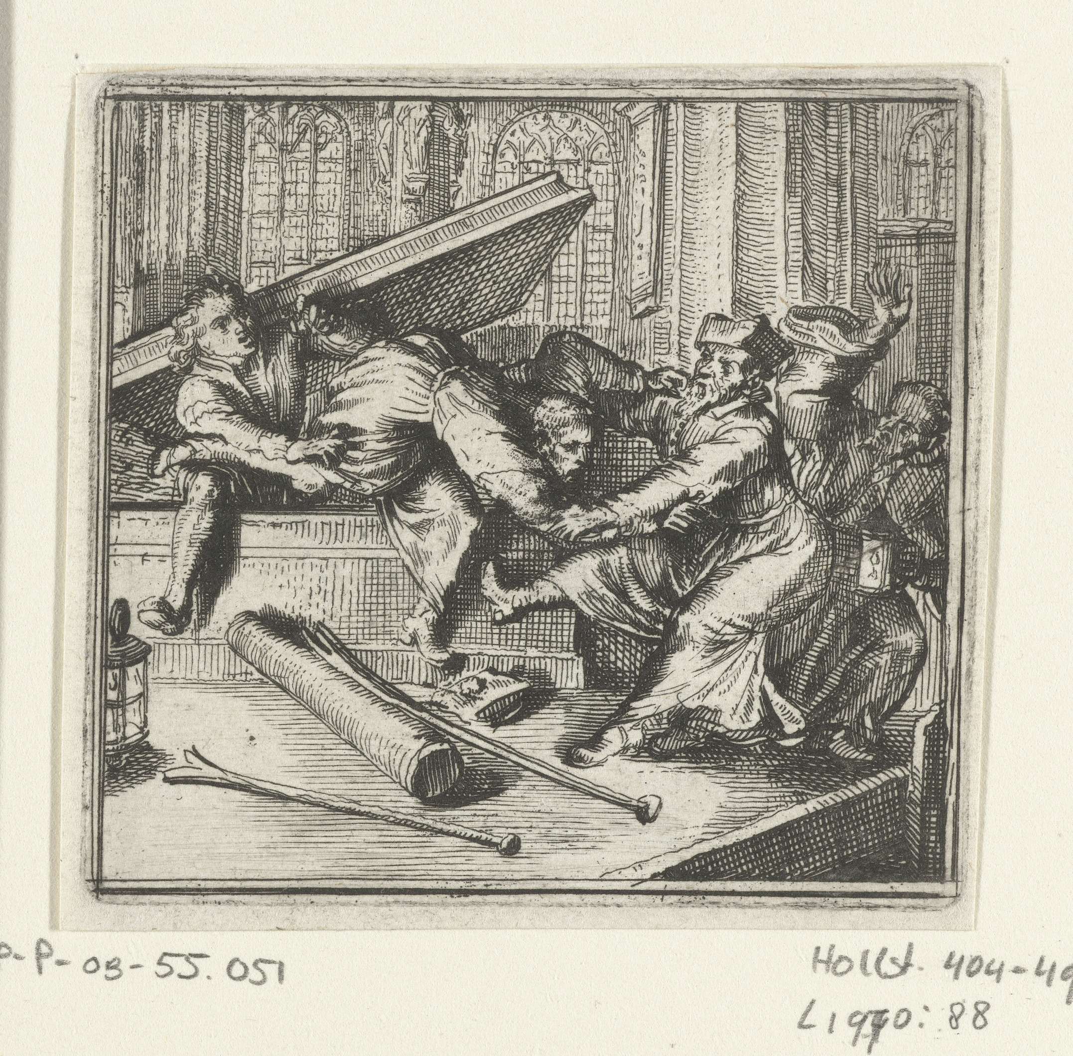 Illustratie voor de Decamerone van Boccaccio, historie XV. In een kerk wordt een man (André) door geestelijken uit een graftombe getrokken.