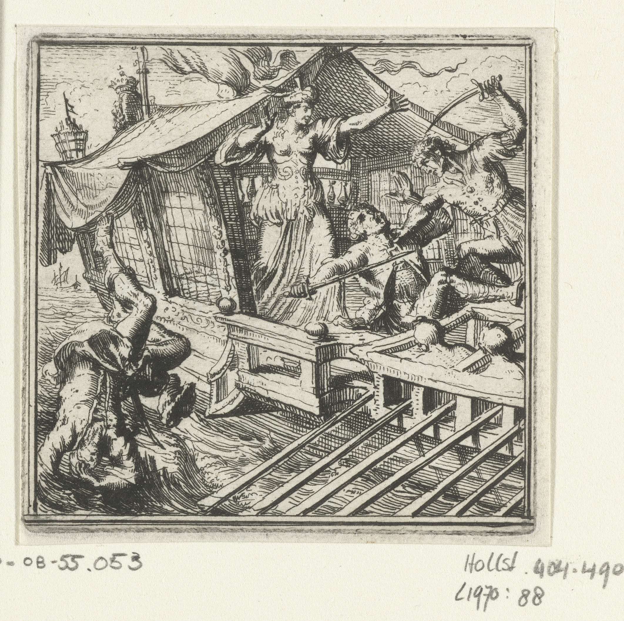 Illustratie voor de Decamerone van Boccaccio, historie XVII. Boot met twee vechtende mannen en een vrouw (dochter van Beminedab) . Een derde man valt in het water.