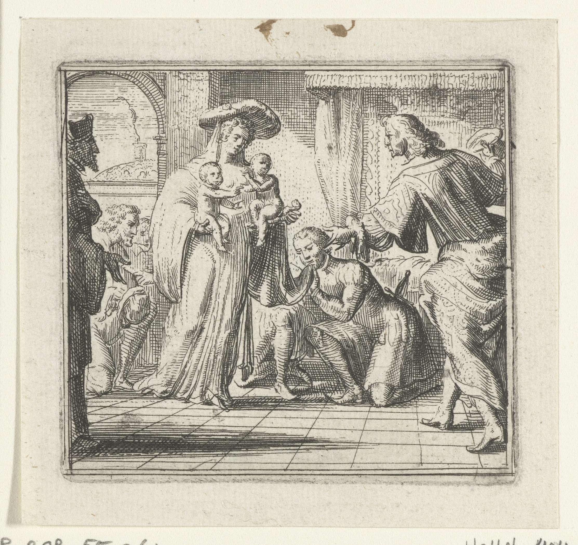 Illustratie voor de Decamerone van Boccaccio, historie XXVIII. Gillette uit Narbonne draagt een baby op elke arm en de graaf van Rousillon staat op het punt zich voor haar voeten te werpen.