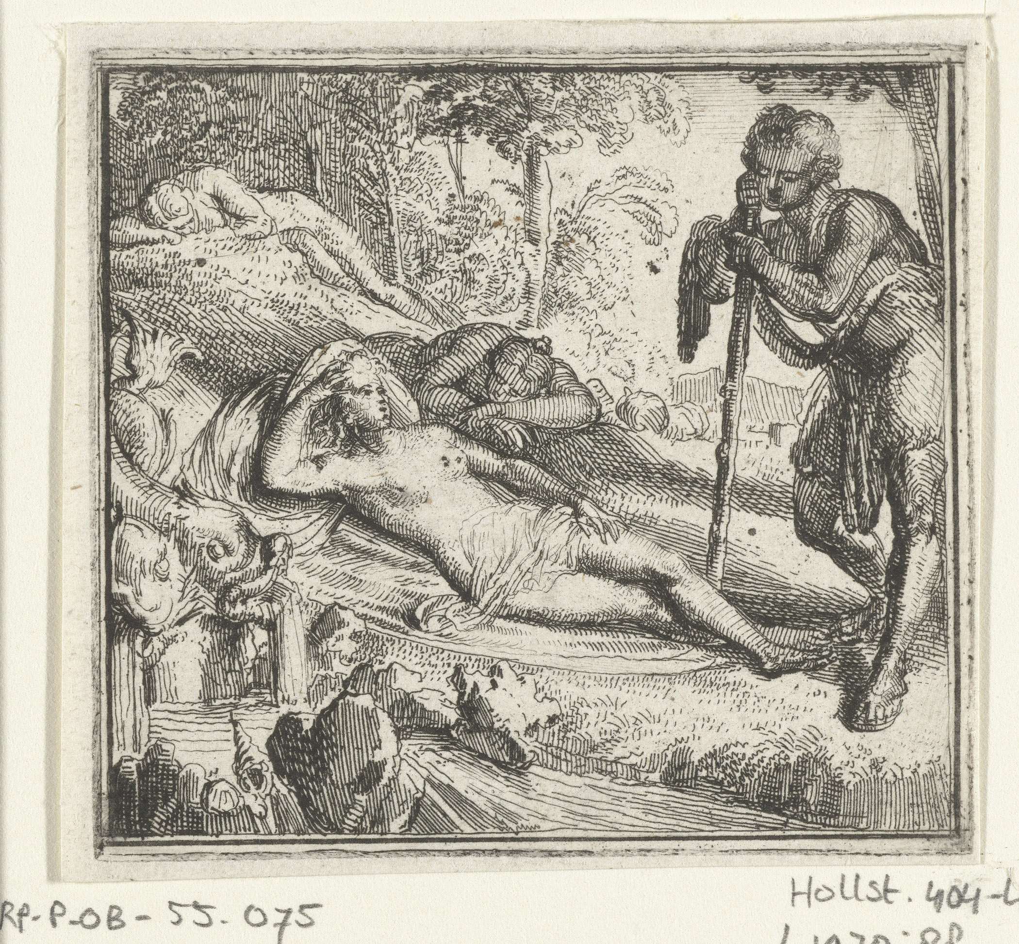 Illustratie voor de Decamerone van Boccaccio, historie XL. Chimon leunt op stok en kijkt naar slapende naakte vrouw die naast een fontein in een weiland ligt.