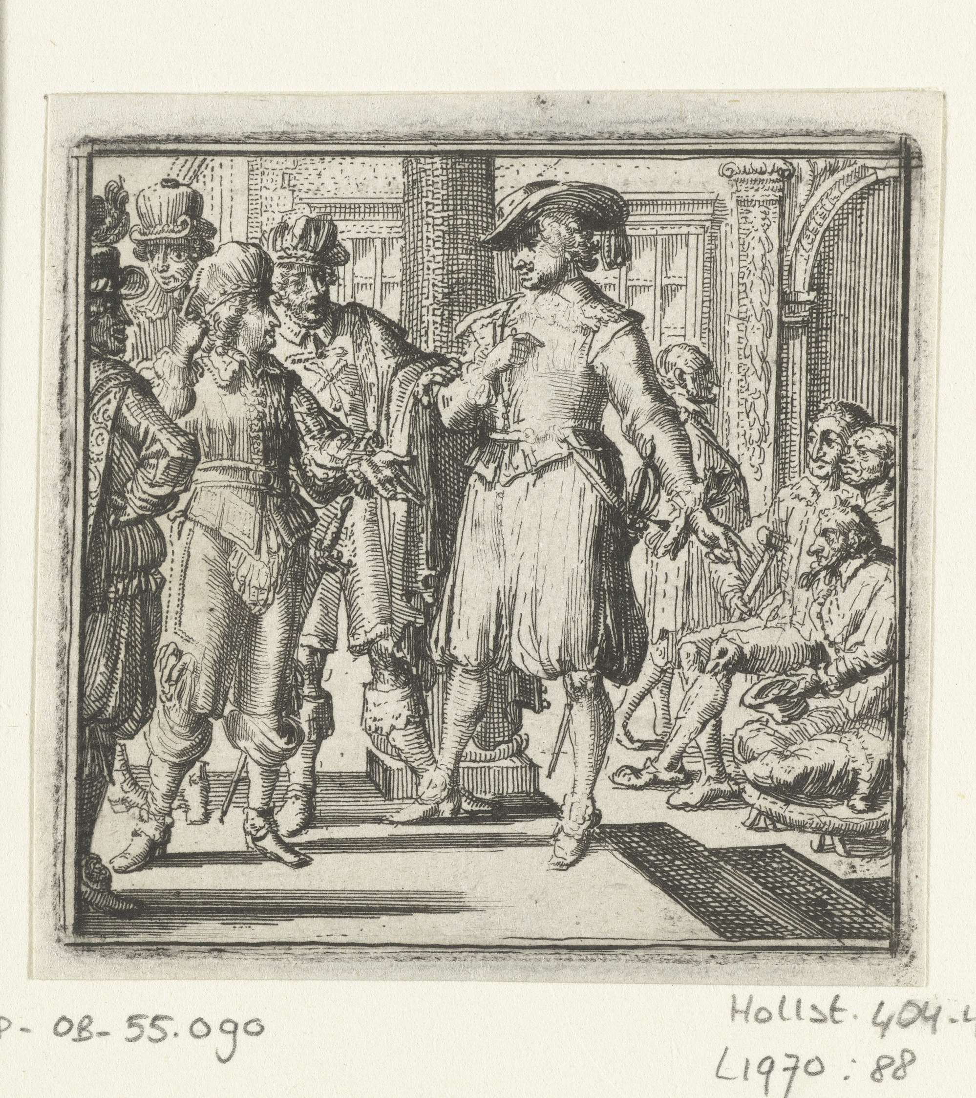 Illustratie voor de Decamerone van Boccaccio, historie LVI. Michiel Scalso discussieert met een groep mannen.