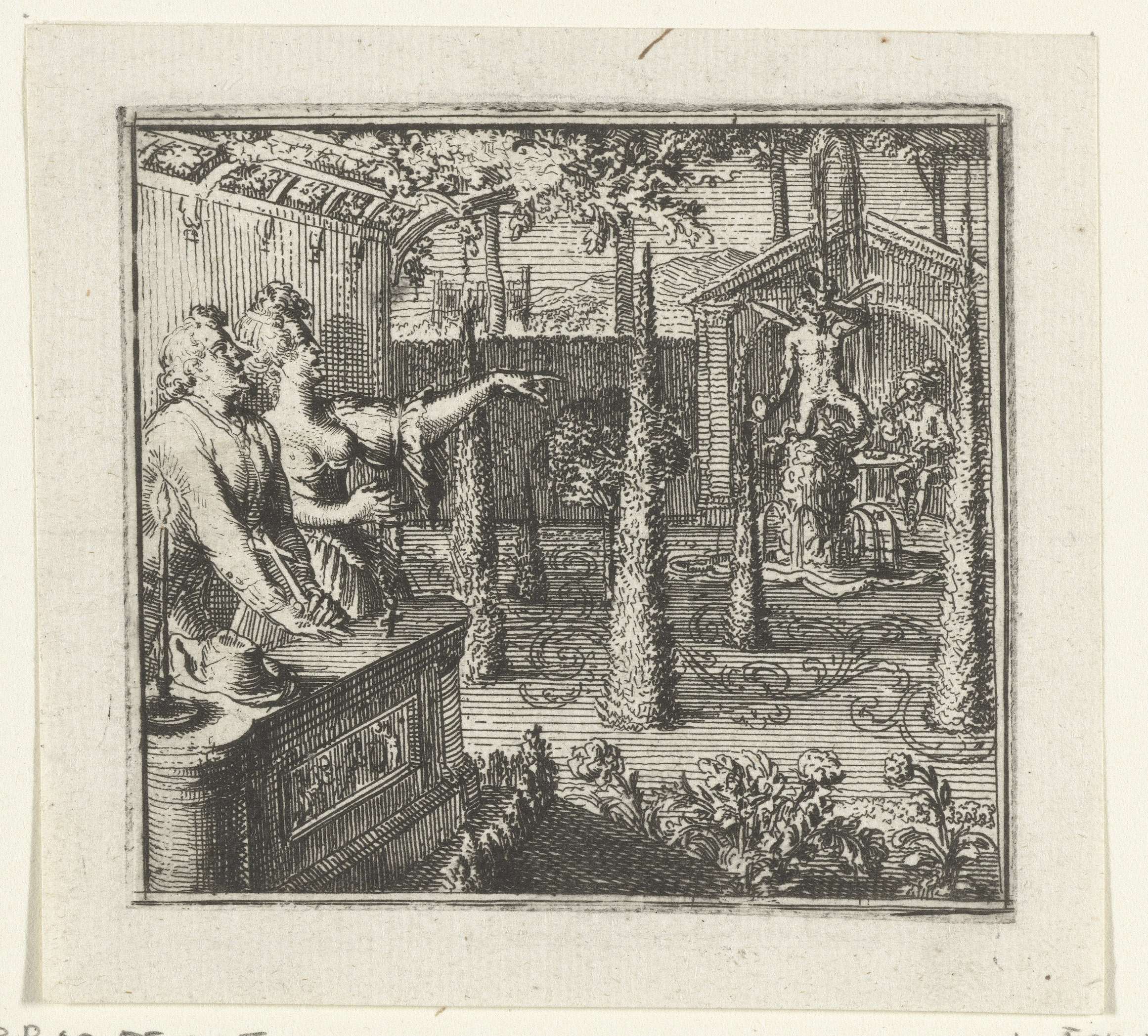 Illustratie voor de Decamerone van Boccaccio, historie LXI. Jan de Lotteringer en zijn vrouw kijken hun tuin in. Mevrouw heeft een rozenkrans vast en wijst de tuin in naar een drinkende figuur in de verte.