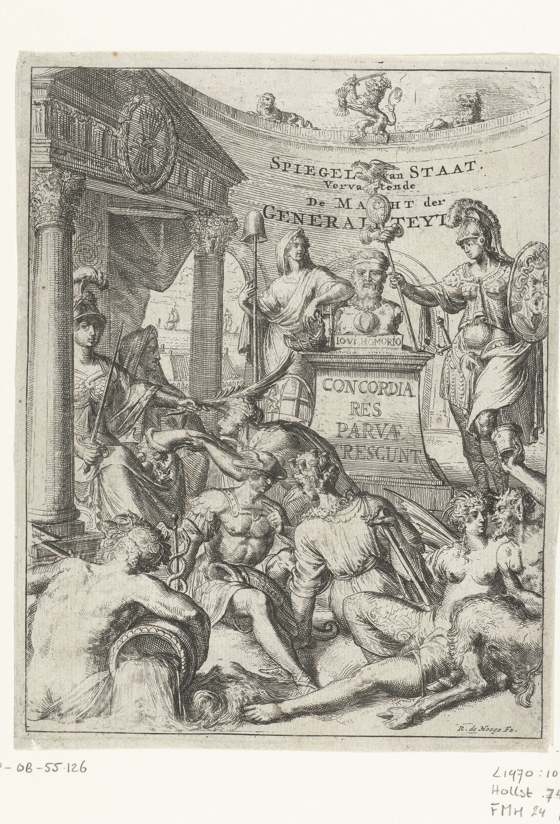 Klassieke tempel waarin zich diverse klassieke figuren bevinden, onder wie Perseus met Medusa op zijn schild, Mercurius met zijn gevleugelde hoed, een stroomgod en een sater. Her en der in de voorstelling symbolen van de rebelse Nederlanden: vrijheidshoed, pijlenbundel, leeuw met pijlenbundel, spreuk 'concordia res parvae crescunt'.