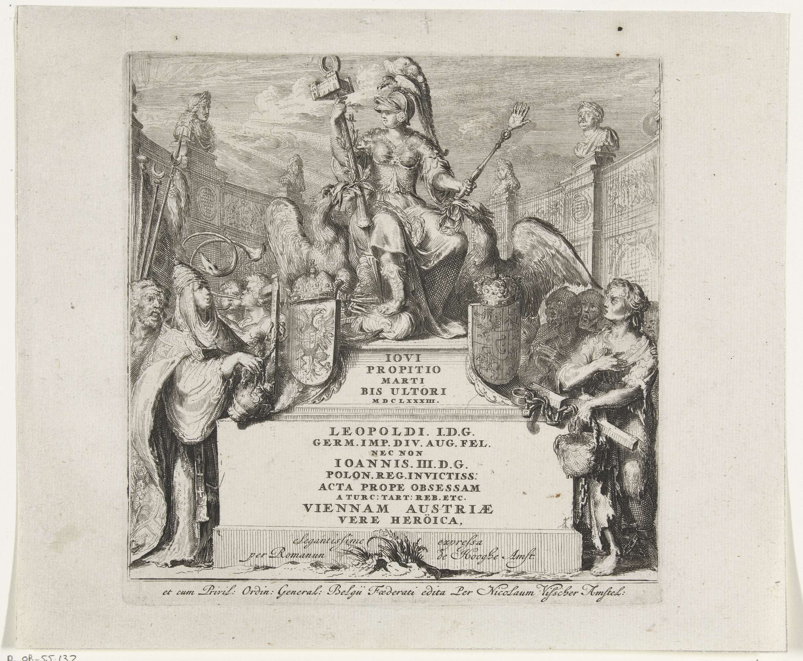 Titelblad voor 'Relation succinte et veritable de tout ce qui s'est passé pendant le Siege de Vienne etc.' Op voetstuk een allegorische figuur van het Habsburgse Rijk die een tulband vertrapt, symbool van de Turken die bij de slag om Wenen werden verslagen.